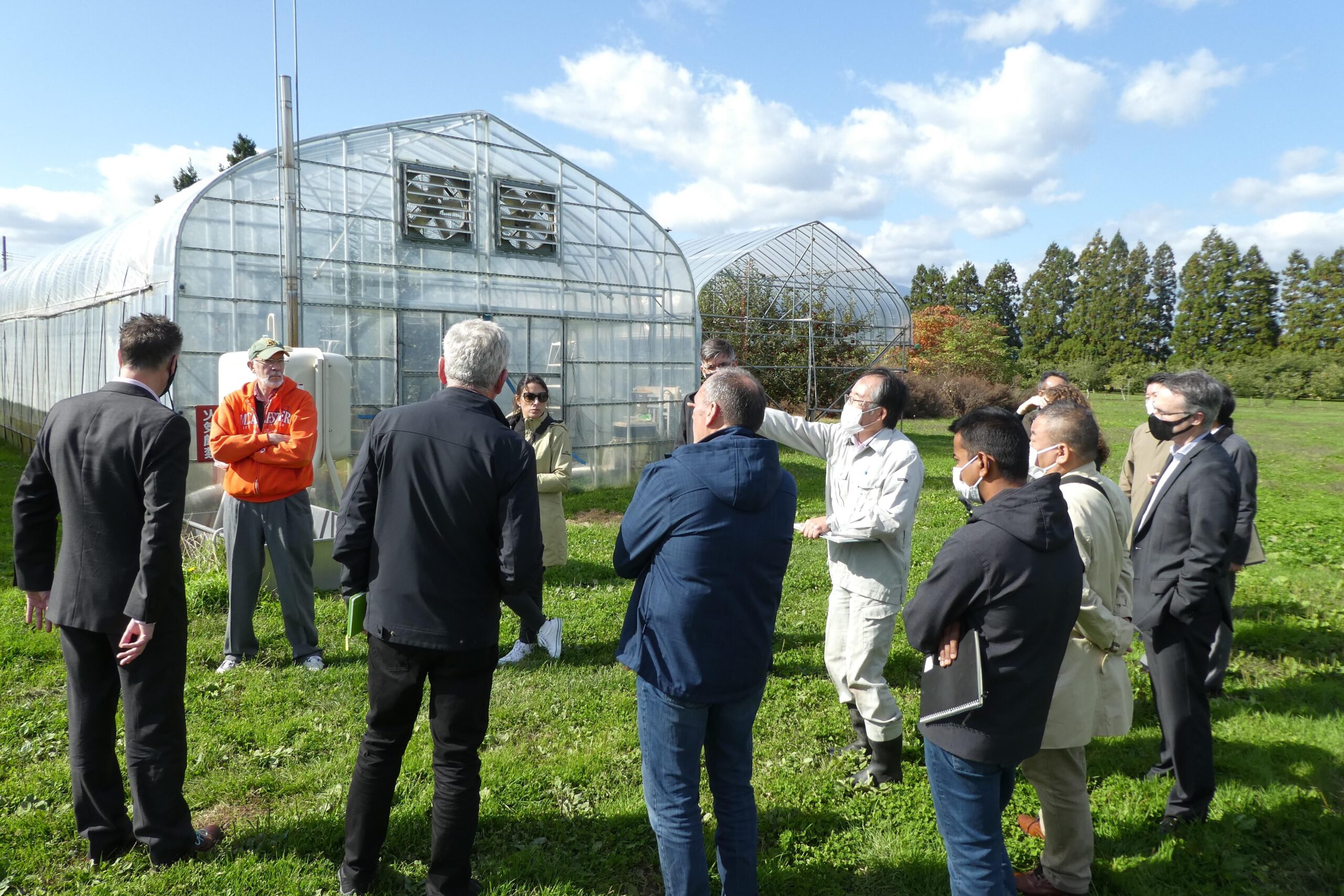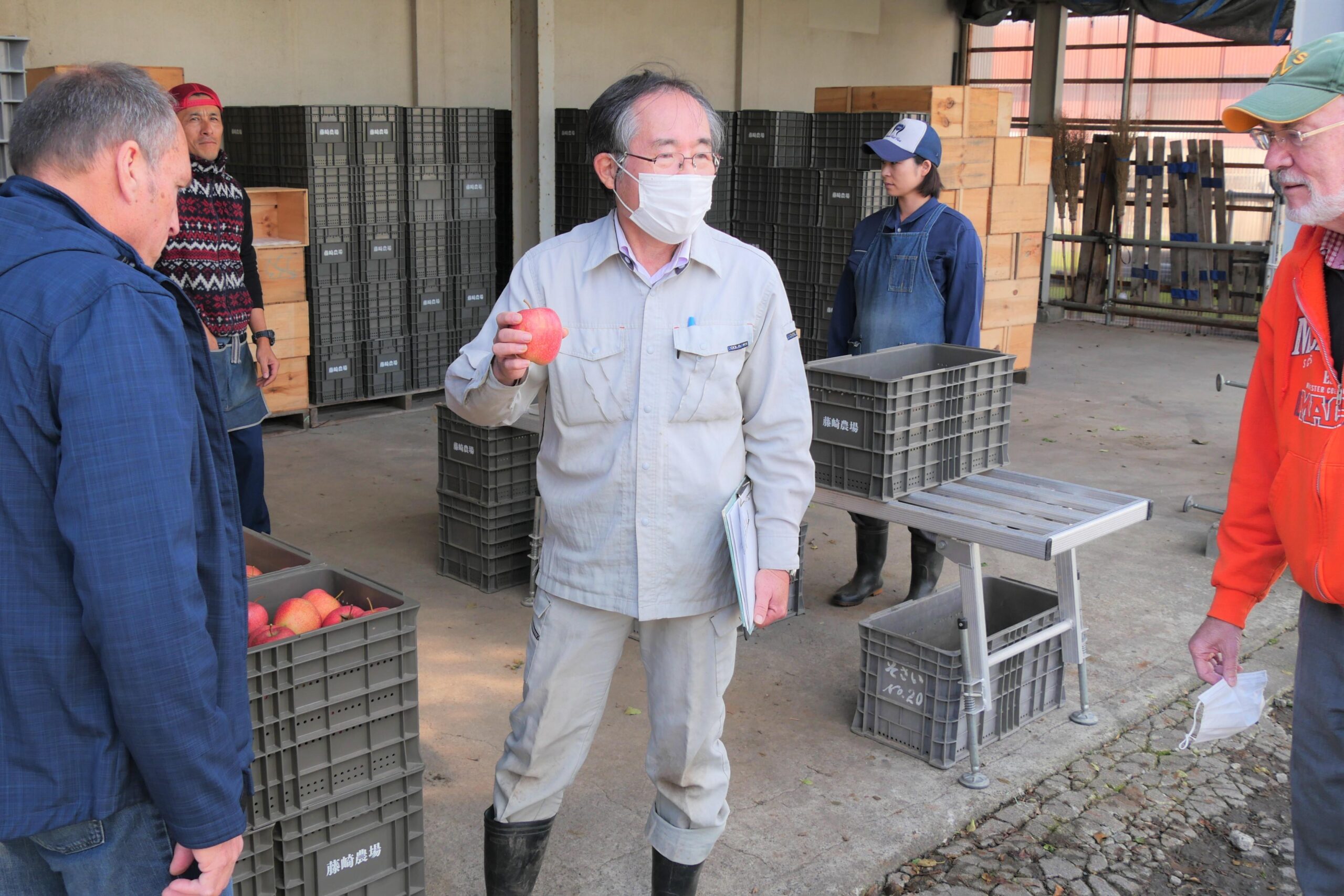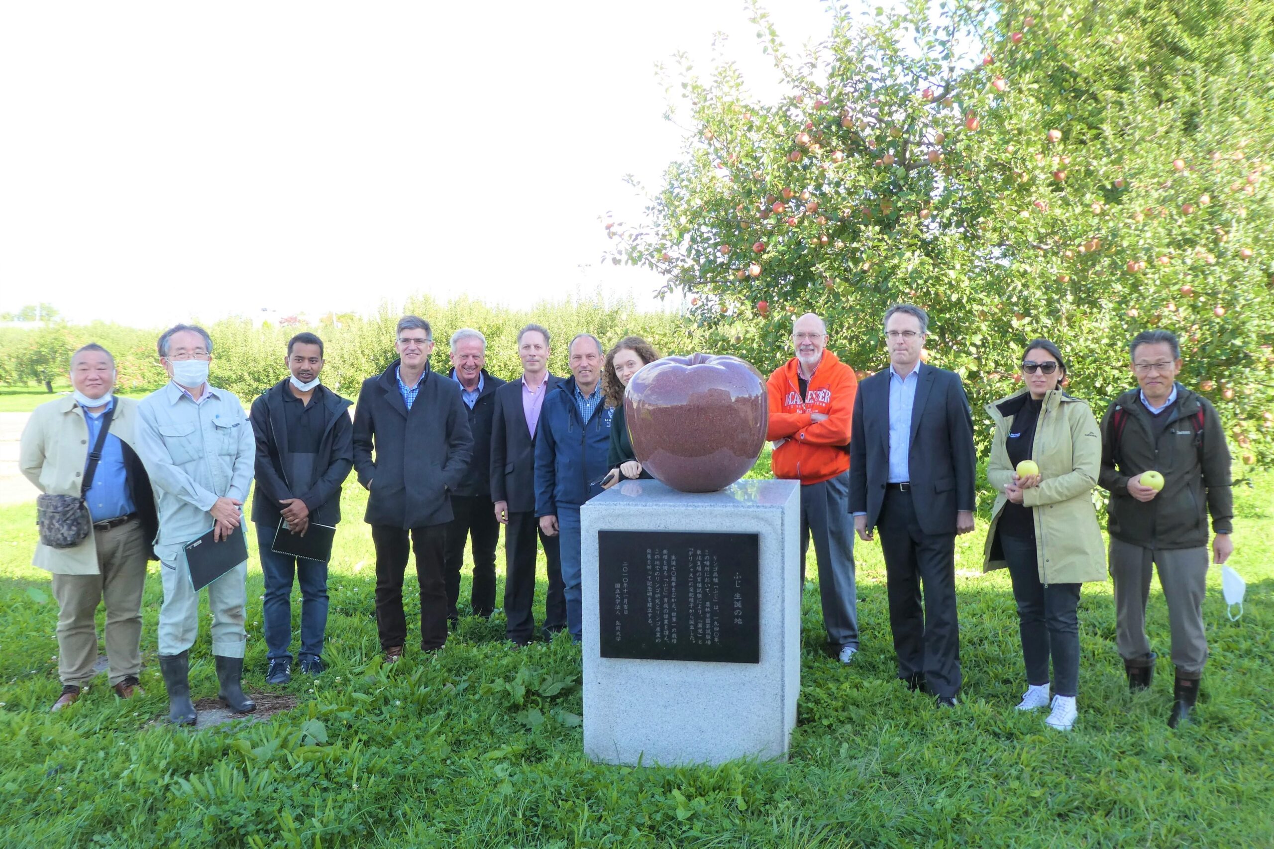 翌日は弘前大学農学生命科学部附属生物共生教育研究センター藤崎農場を訪問。伊藤大雄教授から、弘前大学で育成しているリンゴの品種や栽培方法のほか、伊藤教授自身の研究課題である高二酸化炭素・高温の影響下におけるリンゴ樹の影響について説明を受け、藤崎農場で栽培されたリンゴを試食した。