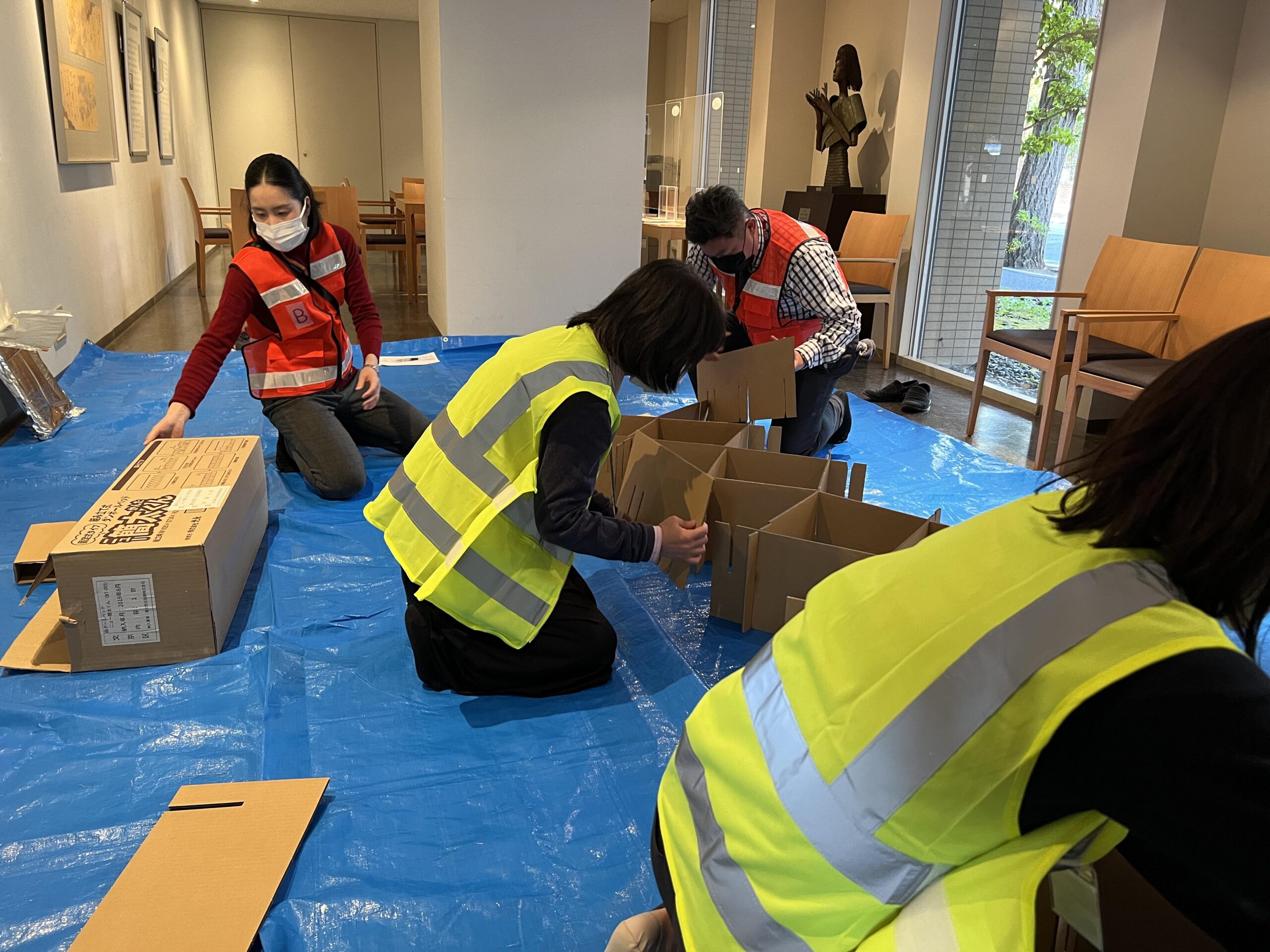 各班への業務指示、施設内外の安全点検、掲示物の貼り出し、受付の設置、医療スペースの準備(ブルーシート・毛布の設置、ダンボールベッドの組み立て)、災害時用トイレの準備、居住スペースの設営