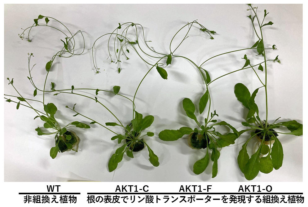 同研究チームでは、リン酸トランスポーターを植物全体で強化することがリン酸の吸収と輸送をかく乱していると考え、根の表皮で特異的にリン酸トランスポーターを発現させました。具体的には、シロイヌナズナの根の表皮で強く働くAKT1プロモーター(注3)で制御したコムギ由来のリン酸トランスポーター遺伝子(TaPT2)をシロイヌナズナに組み込み、その効果を検証しました。