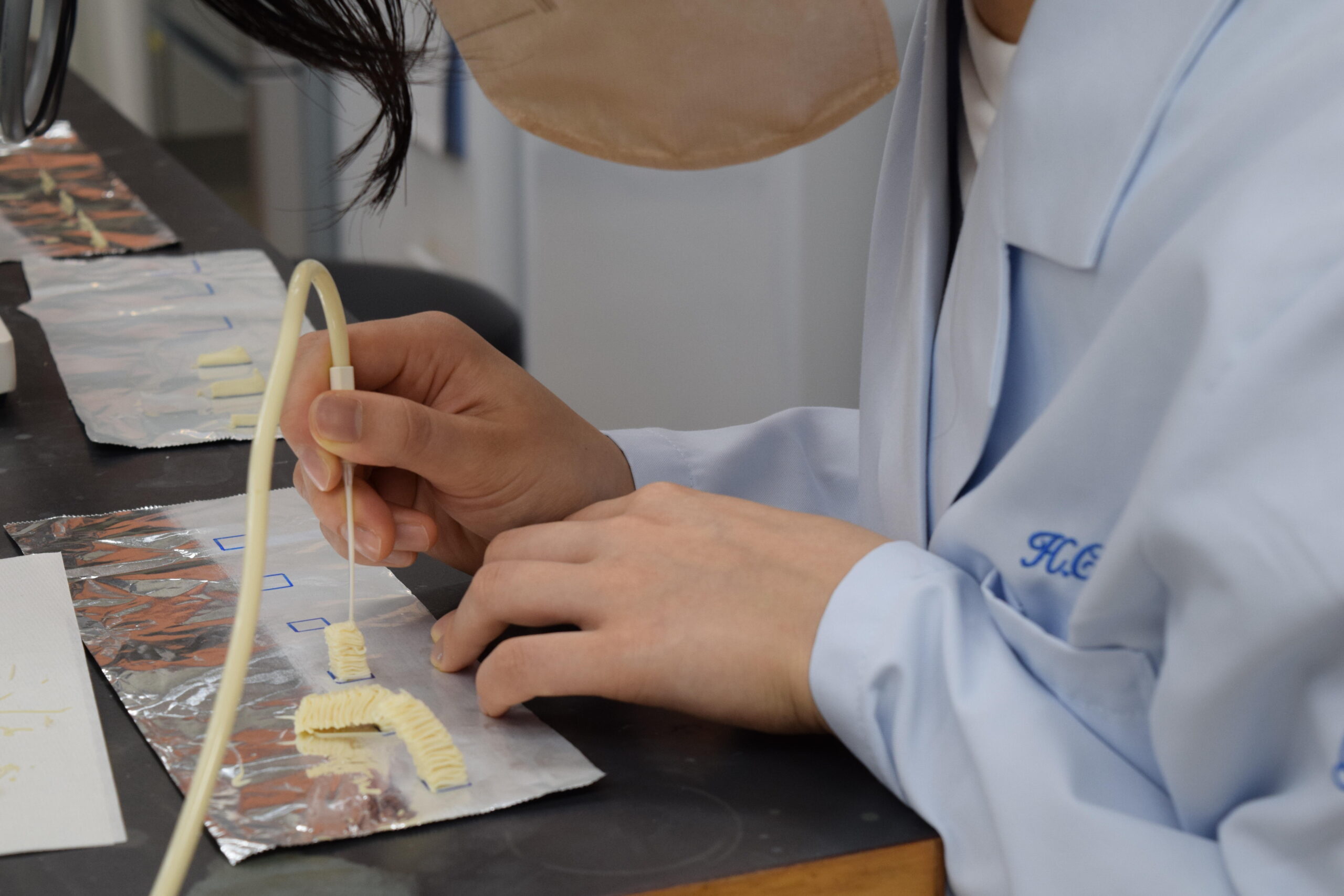 医療や電化製品、教育、建築など様々な分野で期待される3Dプリンター。食用のインクで「食べ物」を形作る”食品の印刷(フードプリント)”も期待される分野の一つですが、口に入れるものだけに安全で成型しやすいインクの開発が欠かせません。これまでチーズやチョコレート、マッシュポテトなど様々な食材で”食べられるインク”の開発が進められてきましたが、食創造科学科の有井研究室は世界でも例のない豆腐由来の3Dフードプリンター用インクの素材開発に成功。実用化に向け、さらに研究を進めています。