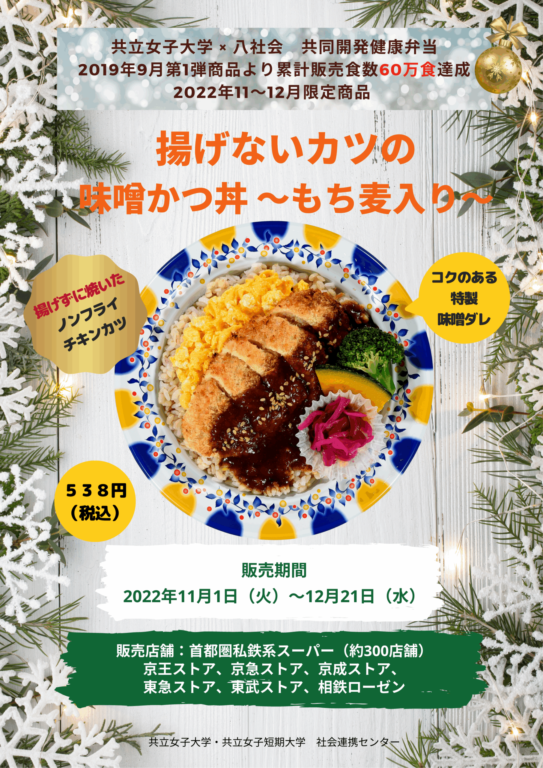 共立女子大学・共立女子短期大学と株式会社八社会 産学連携プログラム 健康弁当共同開発プロジェクトにて商品化された健康弁当商品が、2019年9月1日に第1弾商品発売開始後、2022年8月限定発売第34弾商品「ひよこ豆と夏野菜のキーマカレー(もち麦&大豆ミート&おから入)」2022年8月31日までの3年間で、累計販売食数が、60万食を達成しました。