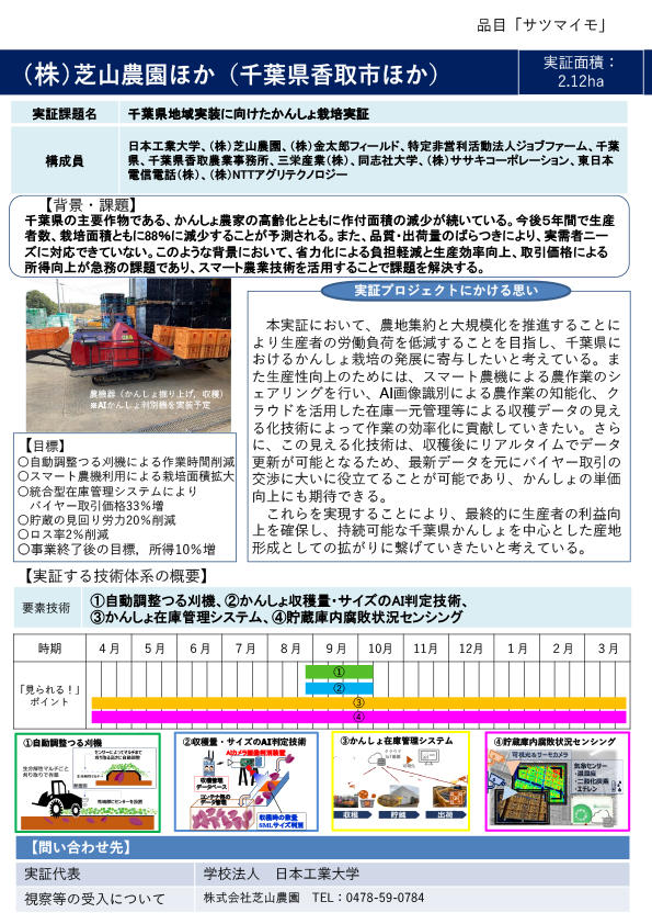 本実証プロジェクトは、かんしょの栽培から収穫、そして貯蔵から出荷までのサプライチェーンとして一連の流れを先端技術を導入した実証を目的としています。本学からは、電気電子通信工学科 プロジェクト代表の平栗健史教授とプロジェクト取りまとめの清水博幸准教授が説明員として参加し、そのほかプロジェクトメンバのNTT東日本 千葉支店、NTTアグリテクノロジーの方にも対応いただいています。