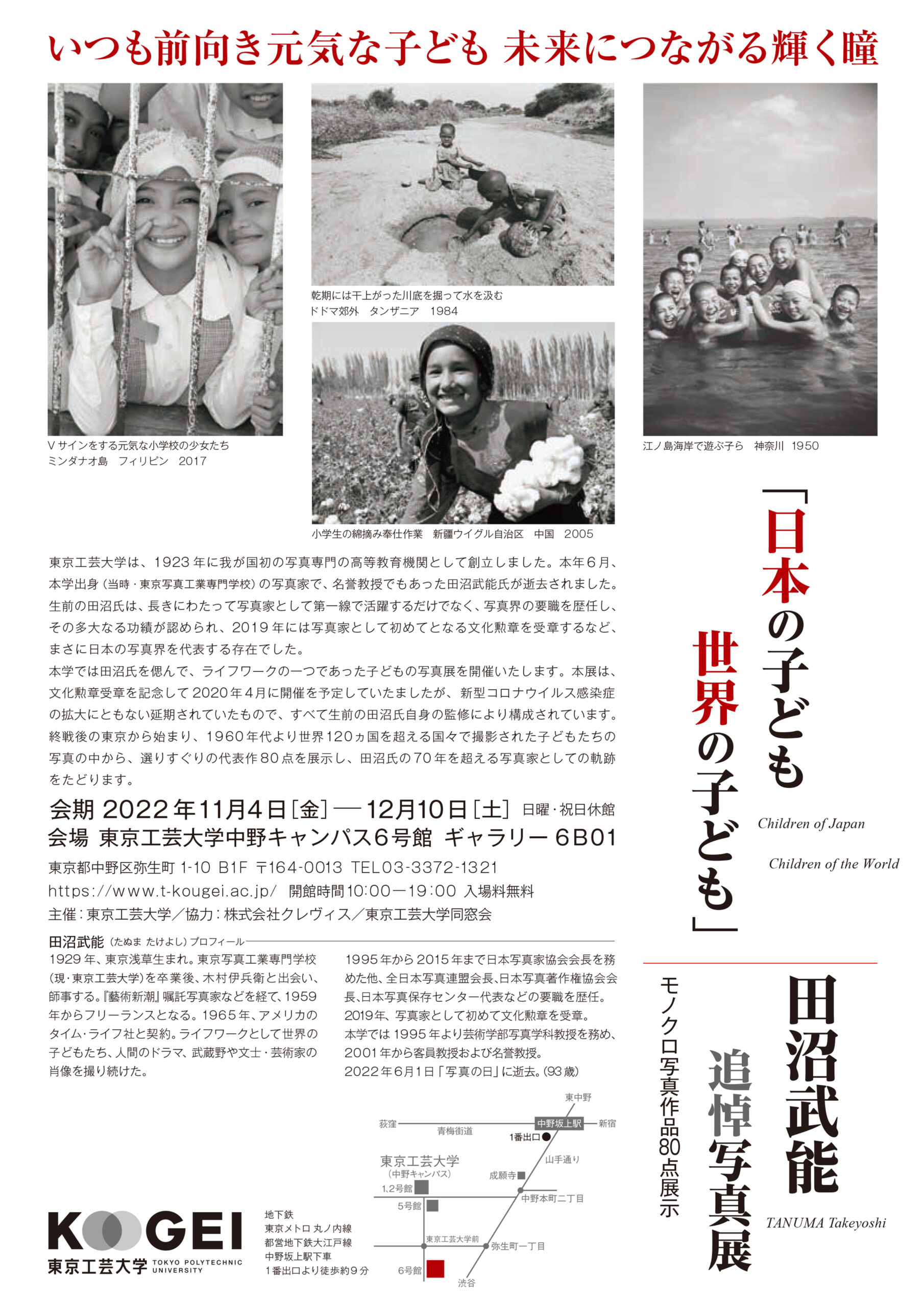 東京工芸大学(学長:吉野弘章、所在地:東京都中野区 以下、同大)は、同大の卒業生で名誉教授であった写真家の故・田沼武能氏の追悼写真展「日本の子ども世界の子ども」(以下、同追悼展)を、2022年11月4日(金)から12月10日(土)まで、中野キャンパス6号館ギャラリー6B01で開催する。