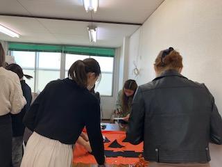 現地調査でわかった瓢箪山商店街が抱える課題「大人から子どもまで全世代の人々、特に若年層に来てもらえる商店街にする」ことを目指し、「2022 サンロード瓢箪山 ハロウィンイベント」の企画と運営に取り組みます。本イベントでは、瓢箪山商店街や駅近辺の地域が連携し、ハロウィン仮装パレードやフォトスポットの設置、ステージ企画を予定しています。学生は商店街の方々と何度も打ち合わせを行いながら、商店街に若年層を呼び込めるような企画を検討してきました。イベントポスターの制作では、学生が提案したデザインの中から商店街組合によって選定されたものを採用するなど、女子大生の発想を活かして地域と協同しています。各チームで役割を分担し、イベントポスターをはじめ、フォトスポット、メッセージボードの制作、商店街のマスコットキャラクターのひょうたクン、せんなりクン、東大阪市のマスコットキャラクターのトライくんの仮装衣装の制作に取り組んでいます。メッセージボードには参加者に「こんな商店街になってほしい」というメッセージを書いてもらい、今後の商店街の取り組みに活用する予定です。当日は学生28名、教員3名が参加して、地域の方々と共にイベントを盛り上げます。