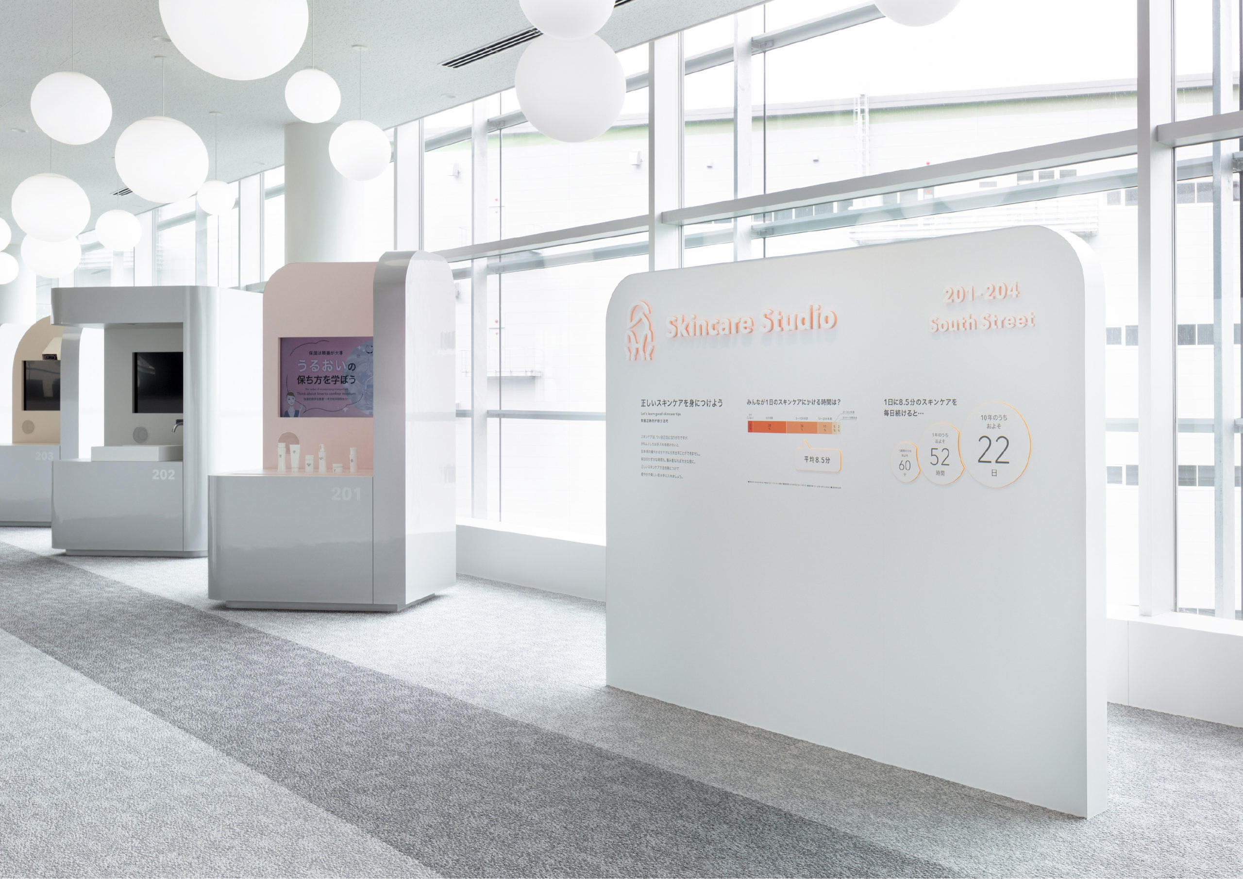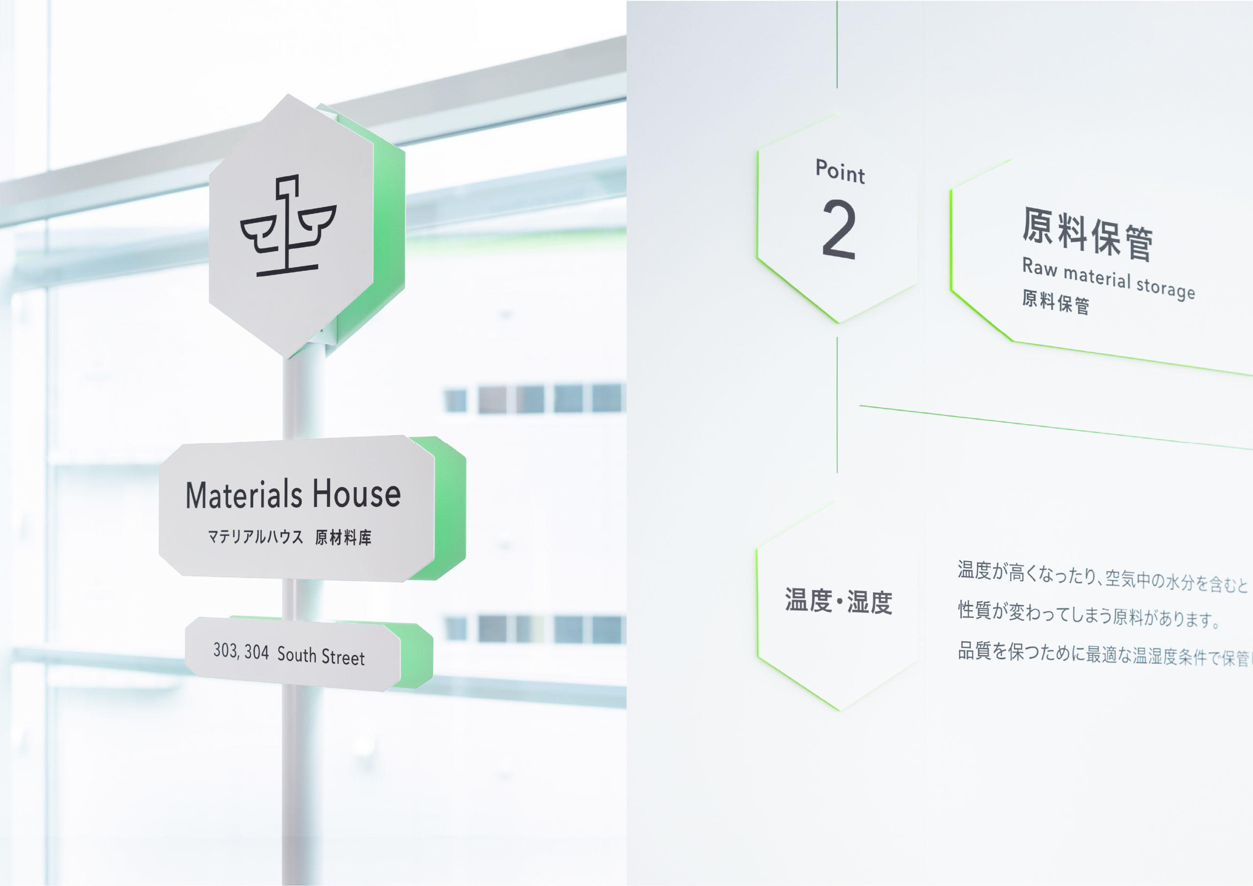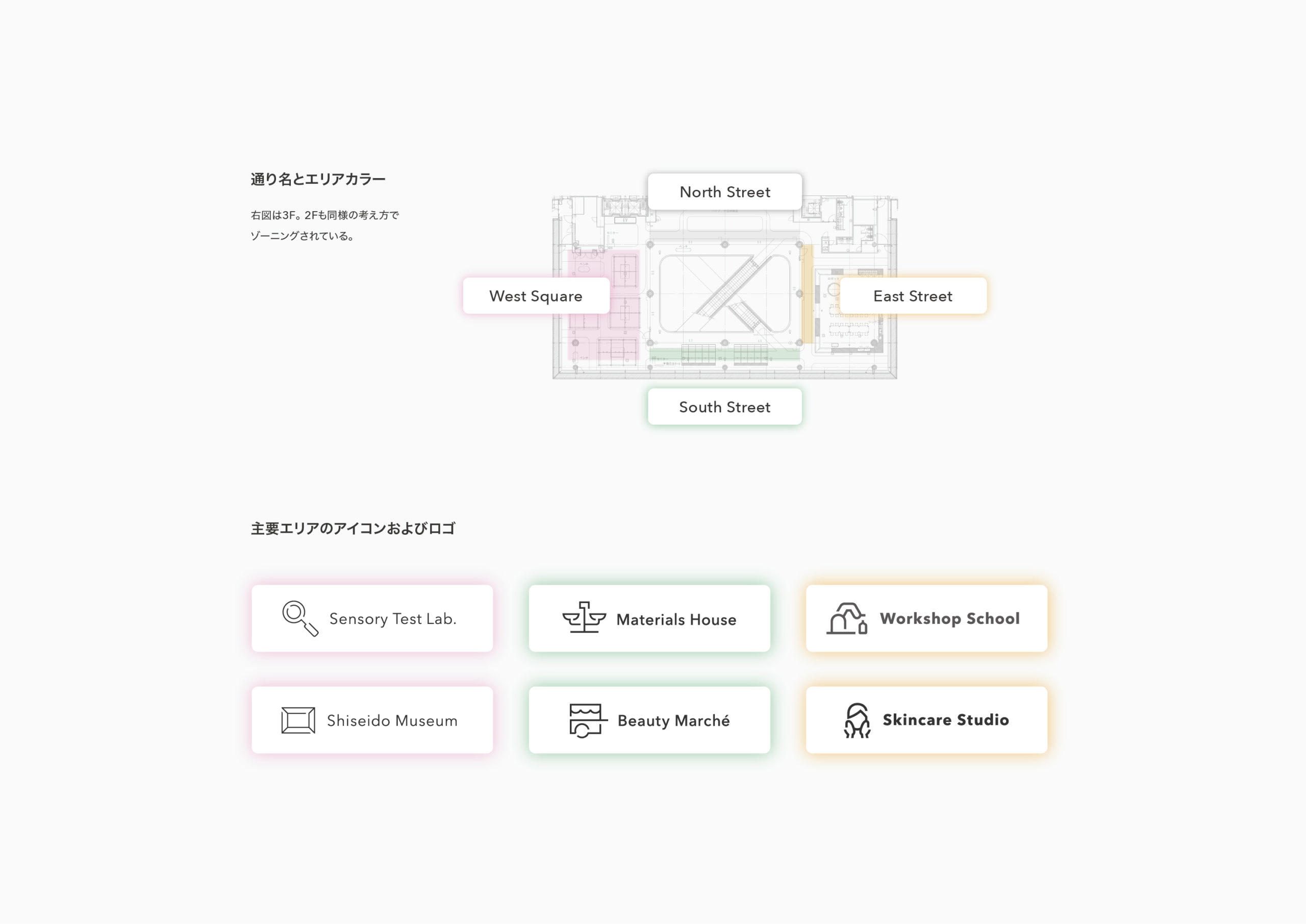 資生堂 大阪茨木工場の見学施設「SHISEIDO BEAUTY SITE」のサイン計画。施設コンセプトは「The journey to beauty(美の旅)」。ミュージアム、ラボ、マルシェといったさまざまなエリアを巡りながら、楽しみながらものづくりを学ぶことができる。