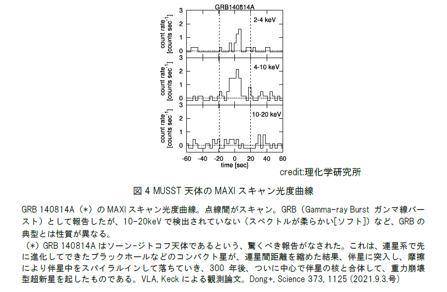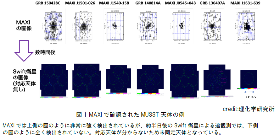 MAXI未同定短時間軟X線突発天体のこと。ガンマ線衛星では検出されておらず、MAXIの1スキャンのみで検出された短時間軟X線突発天体(検出時の光度曲線の例を図4に示す)で、Swift衛星による追観測が行われたにもかかわらず対応天体が検出されなかったもの。正確な位置が分からなかったため可視光などでの追観測ができず、正体不明天体となっている。MUSST天体の正体は、X線フラッシュ(ガンマ線バーストのX線版)や、近傍のdMe星からのフレアかもしれない。しかし、重い白色矮星上の急速新星爆発や宇宙最初の星である初代星が起こしたガンマ線バーストのような新しい天体現象の可能性も考えられている。玉石混交のMUSST天体の中から意中の天体を選り出すには、軟X線での即時観測が必要であり、OHMANによる調査が待たれる。MUSSTはMAXI unidentified short soft X-ray transientの略。