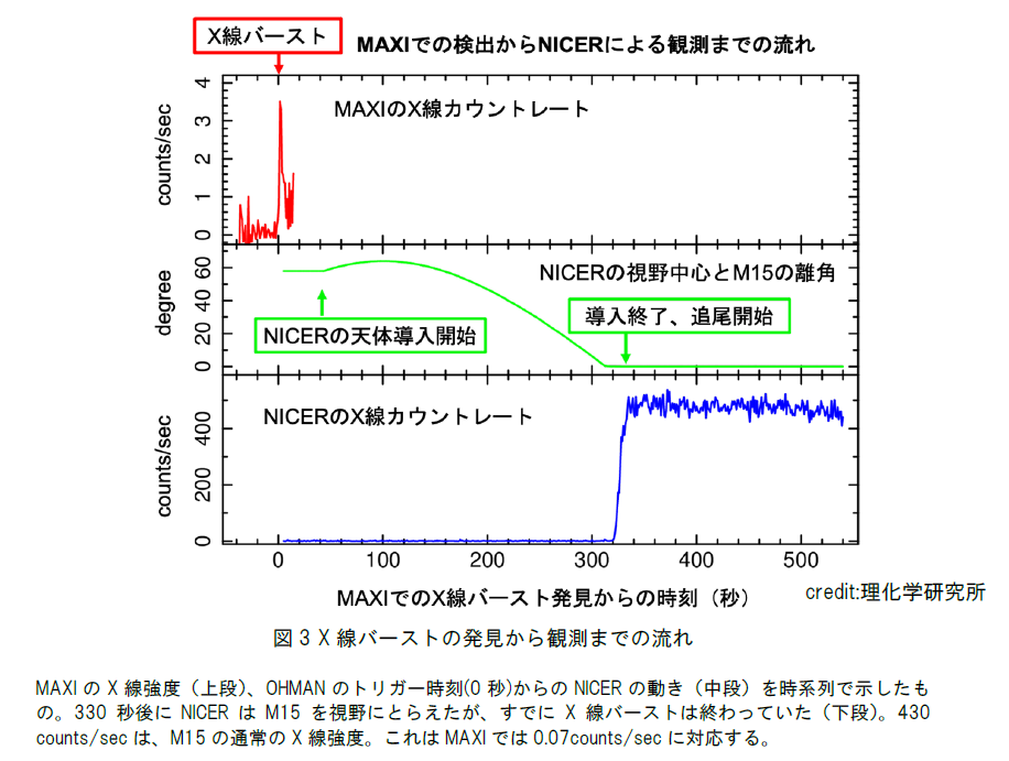 2020年11月からNASAジョンソン宇宙センター(JSC)のISSチームと宇宙航空研究開発機構(JAXA)の「きぼう」船外利用担当によるOHMANの準備が本格化し、2022年5月26日から稼動しました。その後13日間の動作検証と2カ月半の試験運用を行い、8月10日から本格運用を行っていました。9月13日には、MAXIがペガスス座のM15球状星団からのX線バーストを発見し(図2)、その5分30秒後からNICERが自動観測を行うことに成功しました(図3)。