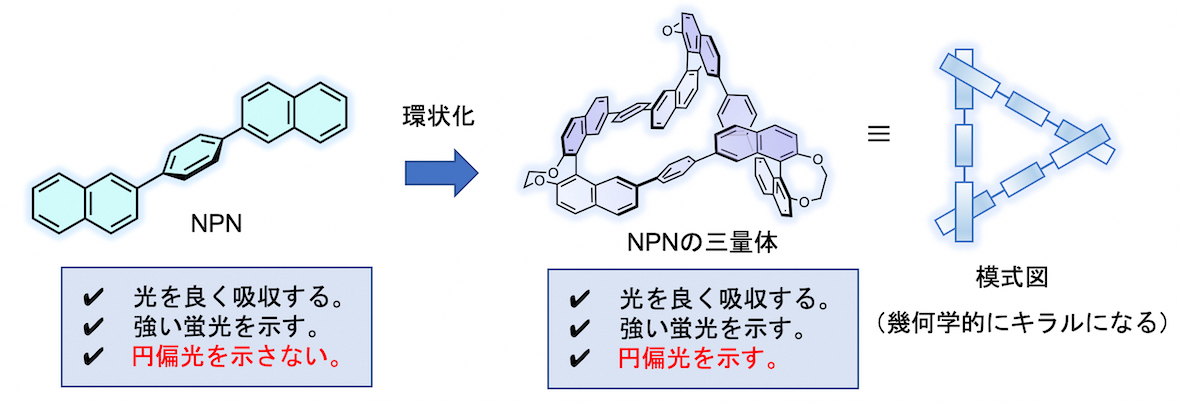 本研究では、よく光る「ナフタレン-フェニレン-ナフタレン」ユニット(以下NPN)をねじりながら環状につなげた分子を3種類(鏡像関係にあるR体とS体で合計6分子)合成しました【図1および2】。NPNはキラリティーをもたないため、円偏光を示しませんが、これを「ねじれ」を生むユニットである軸不斉ビナフチルと繋ぎ合わせることで、キラルな構造となり円偏光を示すようになります。また、両サイドからアルキル基で固定することで、ナフタレンの熱振動を制限し、特性の向上を目指しました。