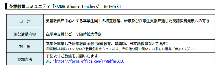 英語(語学)教員コミュニティ「KANDA Alumni Teachers’ Network」の発足を記念して、10月23日(日)に「公開講座」及び「発足記念の懇親会」が本学で開催されます(無料)。より多くの卒業生のご参加をお待ちしています。