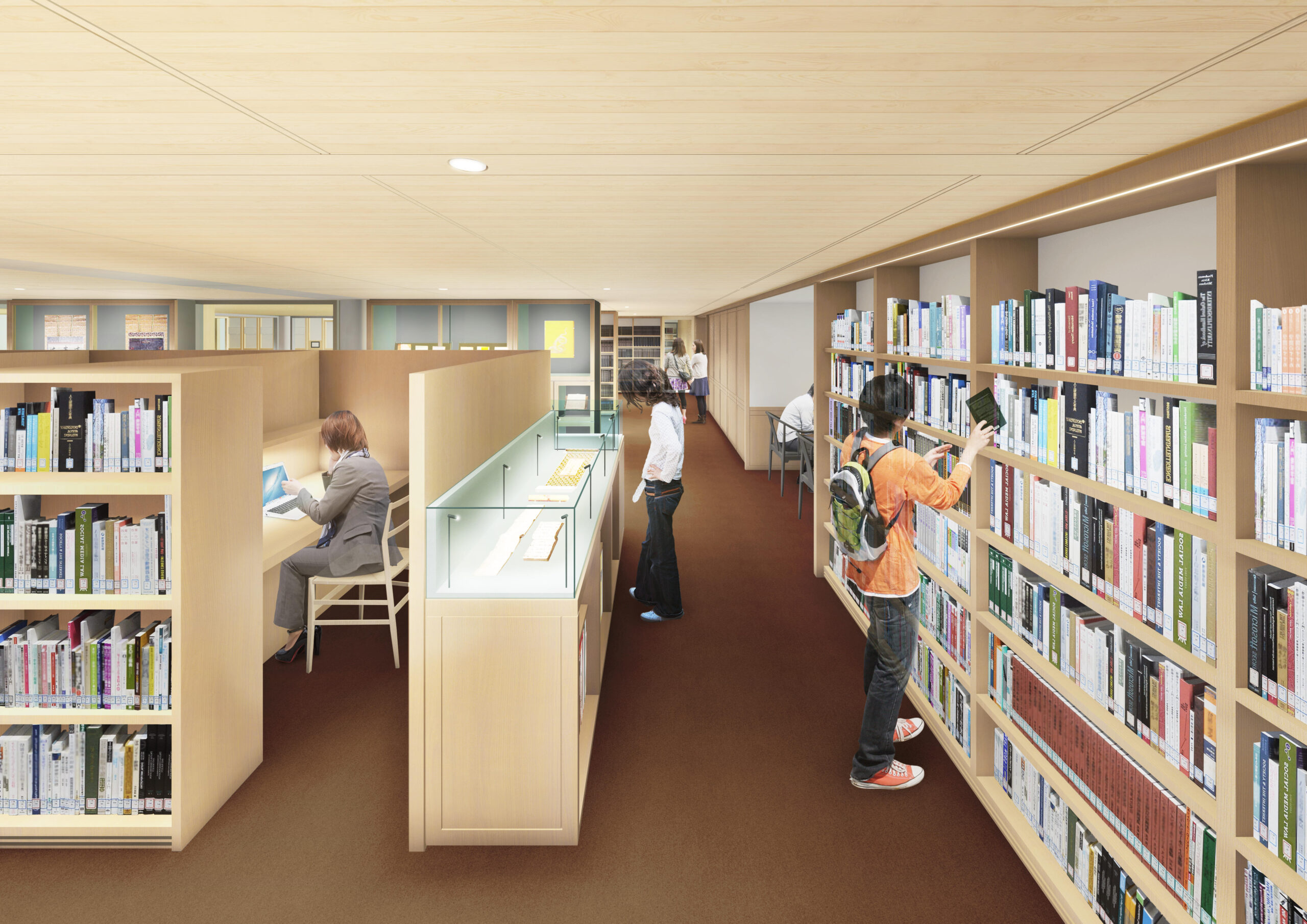 天井が高く明るい閲覧席のほか、既存図書館にはなかった交流や協働するスペースを作り、ゼミ活動などの協働作業を行いたい学生も利用しやすくなった。同時に、研究や学修に没頭したい利用者向けに個室感のある閲覧席を設置するなど、多様な学修スタイルに応じた図書館となっている。