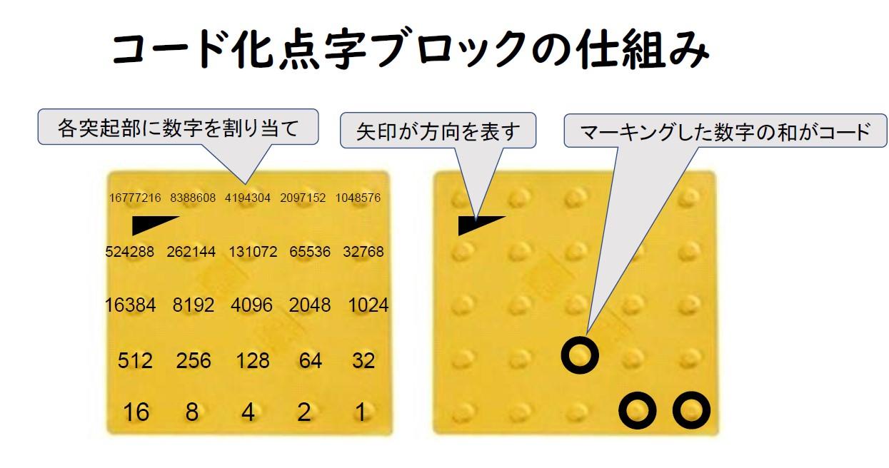 このシステムは、点字ブロックの25個ある点に色をつけた「コード化点字ブロック」をスマートフォンのアプリで読み込むことで、音声情報を提供するもの。視覚障がい者の方が誘導情報を選択できるのはもちろん、観光客や外国人に向けの観光情報を提供することもできます。コード化点字ブロックは、歩行者の進行方向によって異なる情報の提示が可能で、1枚の点字ブロックにつき2の25乗で約3,000万種類、さらに4方向あわせて1億3,421万7,728通りの情報提示が可能です。