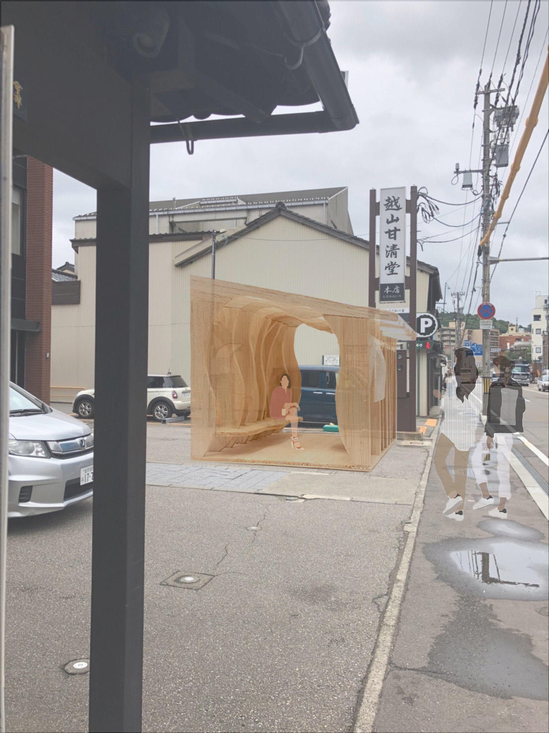 このプレゼンテーションの内容をベースに、金沢市の「木の文化都市・金沢 学生提案モデル事業」として、地域住民や地元の職人、学生が連携し、木の文化都市・金沢を発信するための実証事業を行ってきました。学生たちは、尾張町で木造建築を可能とするCLTを用い、木材を使った交流拠点 交流拠点「木の場-KINOBA-」の設置イメージ のアイデアを練り上げてきました。また、9月13日(火)には尾張町の町民の方とともにワークショップを行い、尾張町に住む住民の記憶や思い出などを聞き取り、交流拠点の活用についてディスカッションを実施しました。