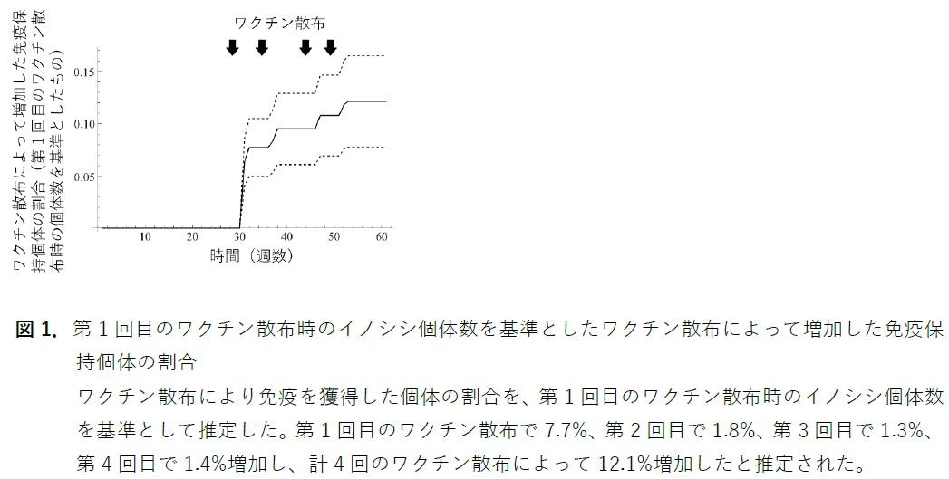 この結果は、国内で実施された豚熱ワクチンの散布により、野生イノシシの群内で、感染によらない抗体価の上昇が起こっていたことを定量的に示した初めての報告であり、今後、この手法で推定されたワクチン散布の効果を踏まえた散布方法の検討や散布後の効果の評価が可能になると考えられます 。