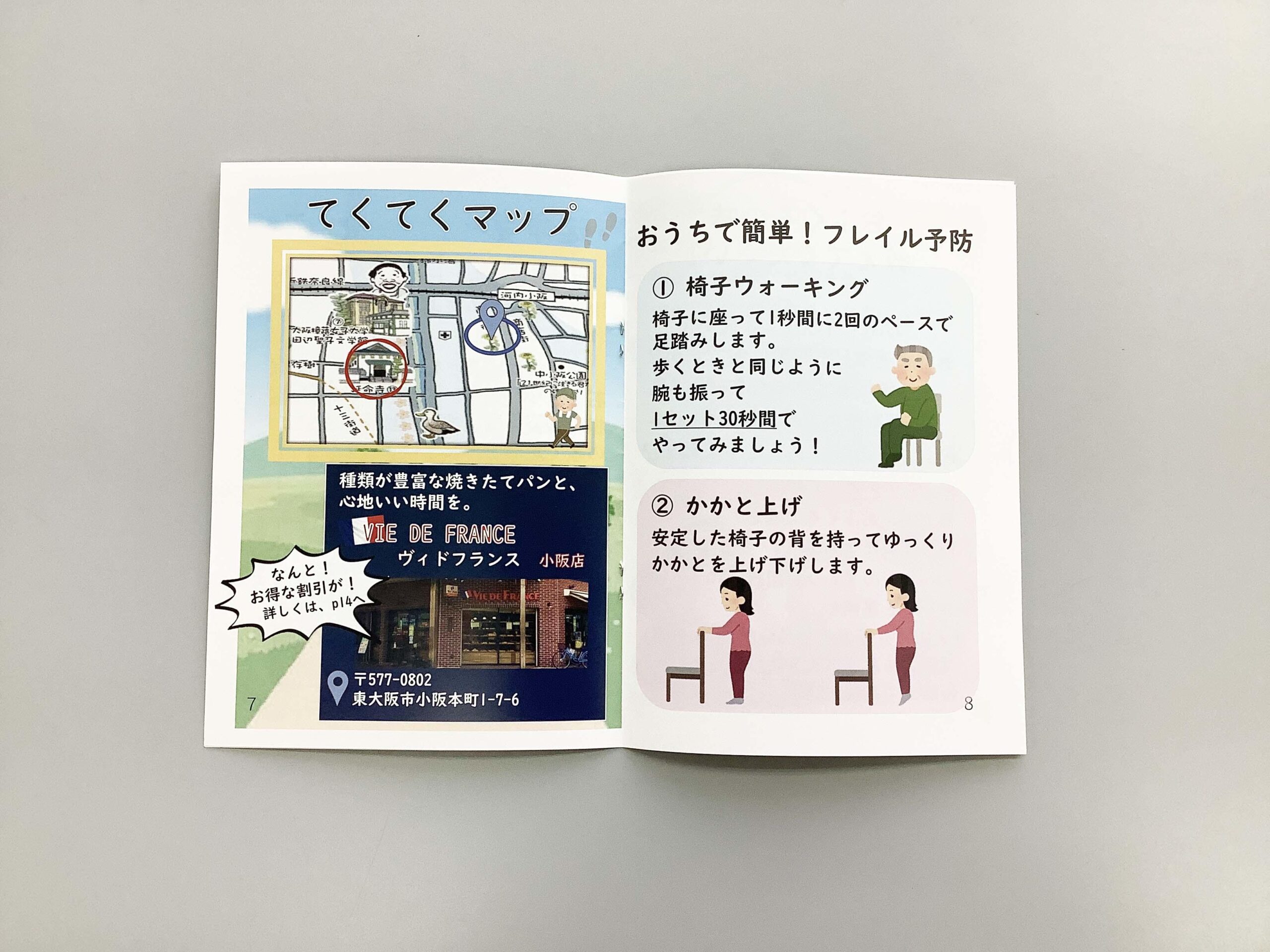 コロナ禍の自粛期間中は、不要不急の外出を控えるよう要請が出ていましたが、自粛期間解除後もそのまま引きこもってしまう高齢者が多いことを知った学生。高齢者が引きこもらないよう手助けができないかと考え、社会とのつながりを促し、さらには運動にも考慮した冊子『TEKU TEKU~You go!!!友合~』を制作しました。本冊子では引きこもりがちになった高齢者が気軽に外出できるように周辺の散歩スポットを紹介。今回は延命寺(東大阪市菱屋西)の御朱印巡り、VIE DE FRANCE小阪店(東大阪市小阪本町)の紹介とクーポンを掲載して、高齢者に散歩を促します。また家で簡単にできるフレイル予防運動を紹介。さらに読者から”おふくろの味レシピ”を募集して読者にも冊子制作に参加してもらい、高齢者が社会とつながる機会を創出します。本冊子は、永和校区福祉委員会が敬老の日に配布する記念品と一緒に1200部が地域の高齢者に送付されました。学生も地域の方々に加わり、同封作業を行いました。コロナ自粛に負けず、上手に外出できるように多くの工夫を凝らした一冊です。