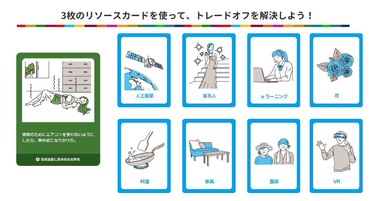 「クロス」は、SDGsの達成に一方を得ようとすると他方を犠牲にしなければならない「トレードオフ」を、さまざまな「リソース」を掛け合わせたアイデアによって解決するゲームです。ゲームを通して、SDGsを身近なものとして理解し、「誰一人取り残さない」という理念を実現するためのアイデア創出力を養います。