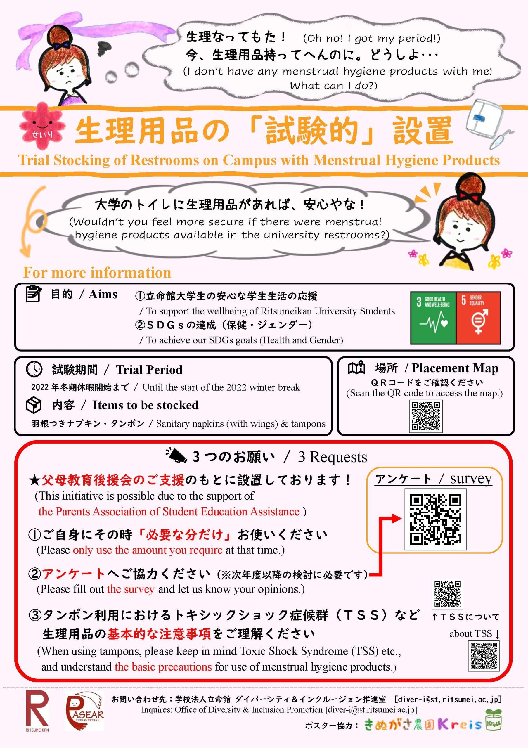学校法人立命館ダイバーシティ&インクルージョン推進室は、立命館大学父母教育後援会の支援を受け、立命館大学の衣笠、びわこ・くさつ(BKC)、大阪いばらき(OIC)、朱雀の4キャンパス内の女子トイレ・多目的トイレ合計42箇所に、生理用品を2022年9月26日(月)より試験的に設置いたします。2023年度の本格導入に向けて、試験期間の3カ月間で利用者にアンケートを実施し、学生の不安に寄り添った快適なキャンパス環境づくりを目指します。