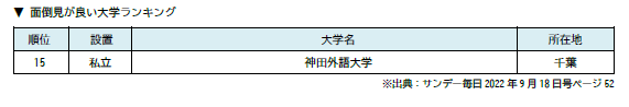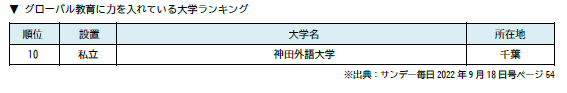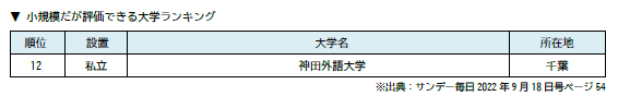 ■ 神田外語大学 全国の進学校2,000校の進路指導教諭を対象とした「小規模だが評価できる大学」「入学後、生徒を伸ばしてくれる大学」ランキングで全国国公私立大学中第9位にランクイン