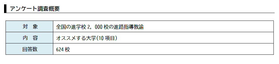 本ランキングは、サンデー毎日と大学通信が全国の進学校2,000校の進路指導教諭を対象にアンケート調査をおこない、624校がオススメする大学についての回答をまとめたものです。