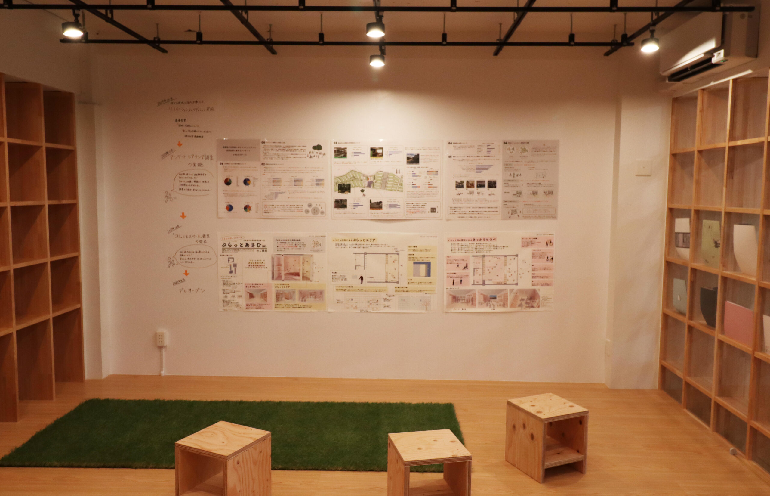 本学とJSは、団地のコミュニティ活性化に寄与する空間に関する共同研究を行っています。今回のリノベーションは、2019年にJSが主催したコンペにおいて、日本女子大学大学院 家政学研究科 住居学専攻 篠原研究室の学生たちが最優秀賞を受賞したことからスタートしました。まずは、学生主体で住民へのアンケートやプレゼンテーションなどを行い、団地におけるコミュニケーションの課題や要望を調査しました。その結果を踏まえて、「ぷらっとあさひ」は学生が基本設計を担当し、JSや設計事務所との実施設計の打合せを重ね、2022年4月に着工し、7月に竣工しました。今年度は、篠原研究室の修士課程1年2名、修士課程2年1名、博士課程(後期)3年1名が本取り組みを担当して完成に至りました。