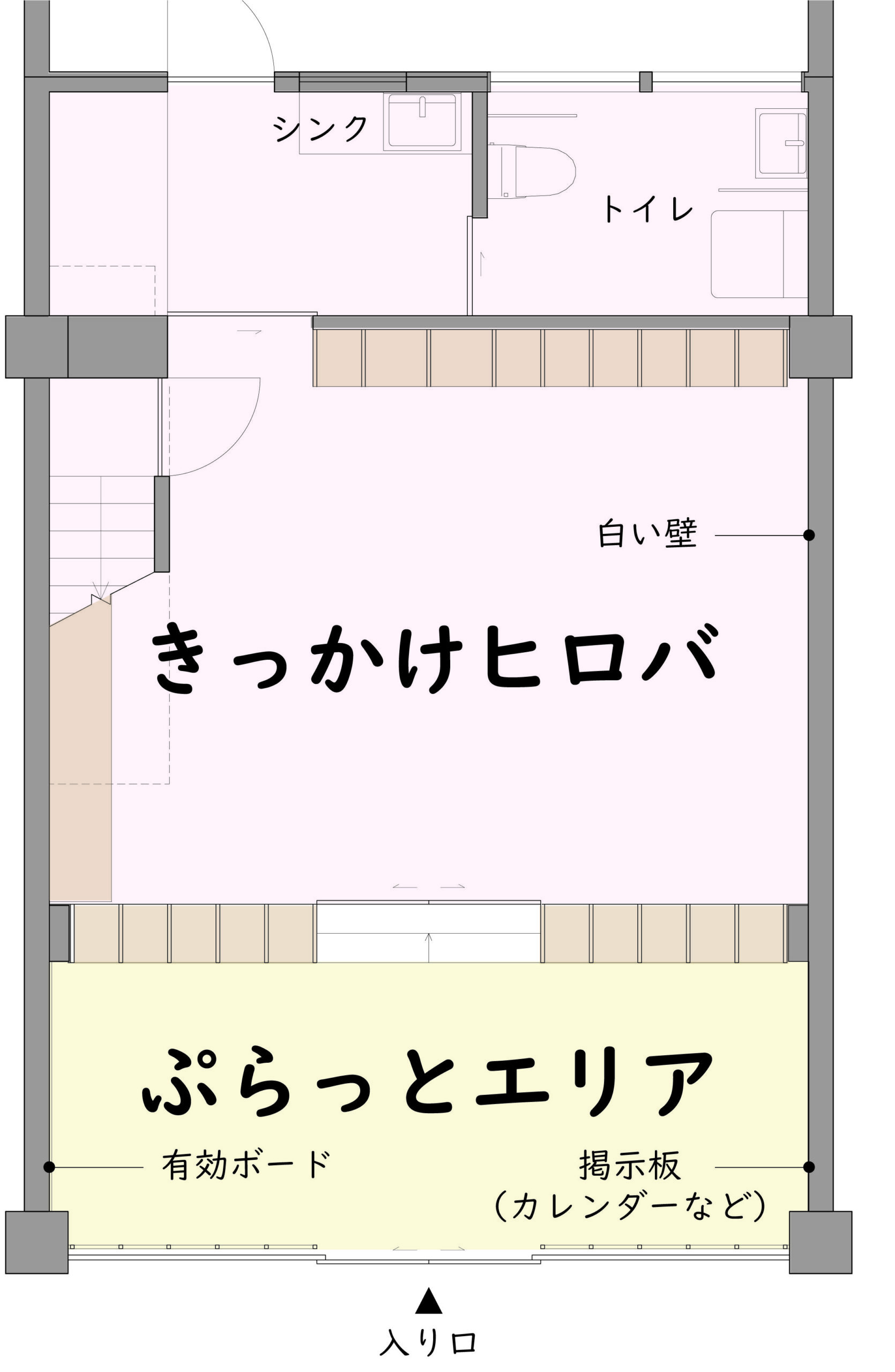 誰もがいつでも気軽に立ち寄れ、日常に溶け込むスペースをコンセプトに考案。モノや空間を通してさまざまな人がつながる「プラットホーム」であり、誰もがいつでも気軽に「”ぷらっと”立ち寄れる空間」であってほしいという想いから、「ぷらっとあさひ」と名付けました。いつでも利用でき情報発信や情報共有の場となる「ぷらっとエリア」と、イベント時に開放される「きっかけヒロバ」で構成されています。