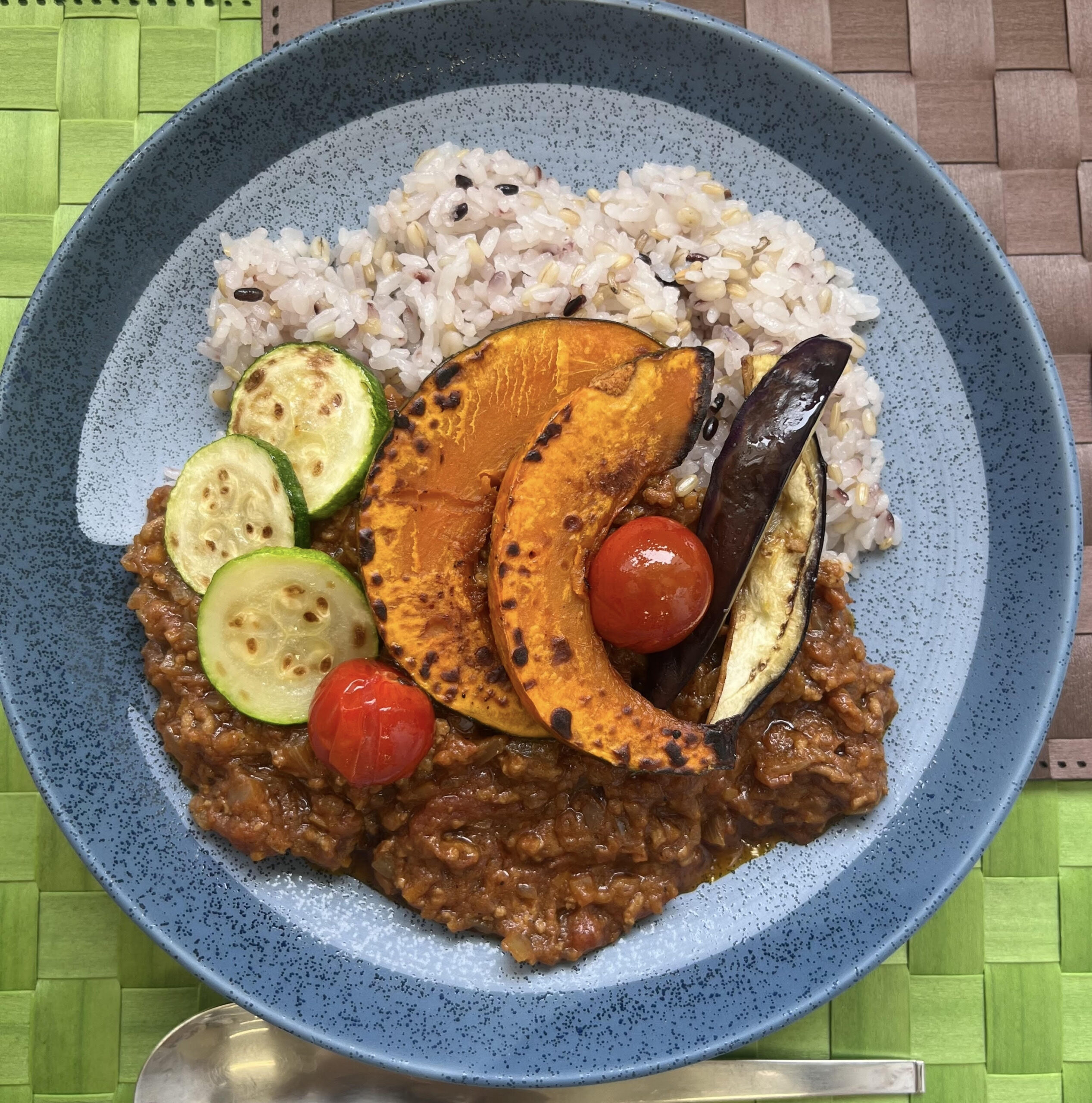 ●夏野菜のキーマカレー:ご飯だけにWE米を使用するだけでなく、カレールーにも粉砕した粉を使用して、より多くWE米を食べられるようにしました。夏野菜をトッピングして彩り良く仕上げました。
