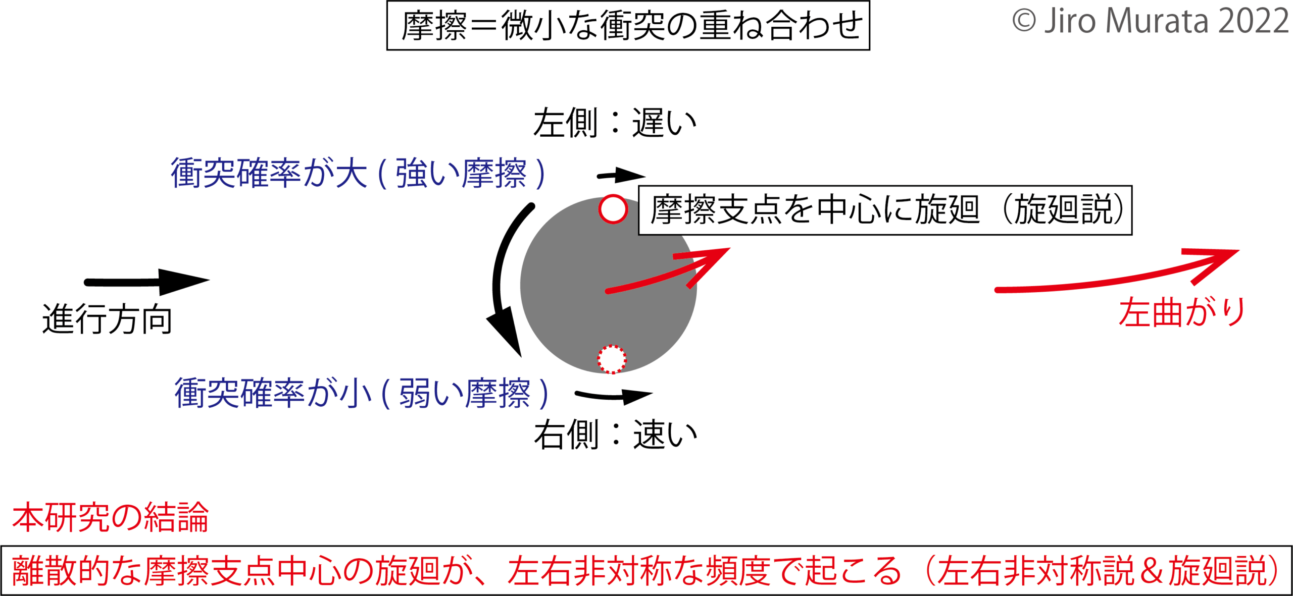 図3: 中心から離れた点での摩擦支点による旋廻が原因とする旋廻説。本研究の結論は左右非対称説と旋廻説を組み合わせたもの。