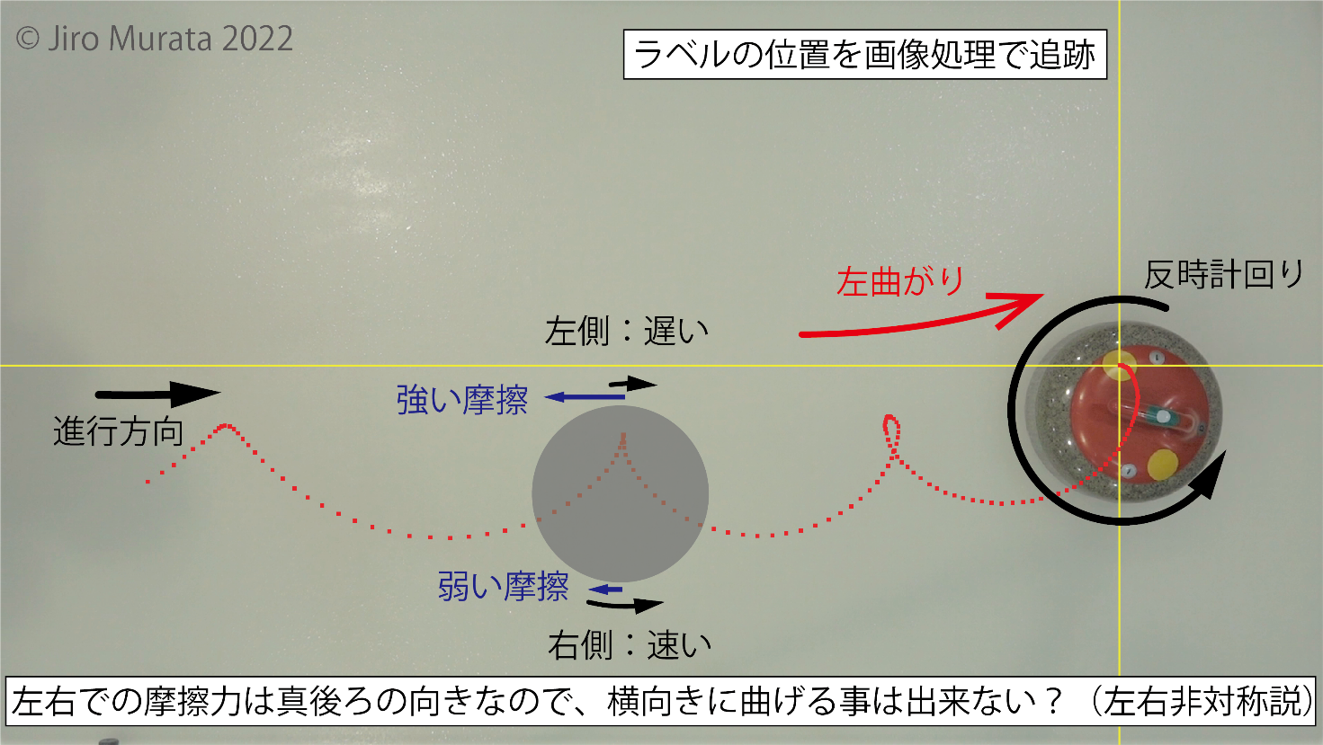 図2: 本研究で行ったカーリング石の軌跡解析。軌跡と共に回転の様子も捉える事が出来た。左右非対称説は、氷に対する速度の違いから左右で摩擦力が異なる事が偏向の原因とする考え方。