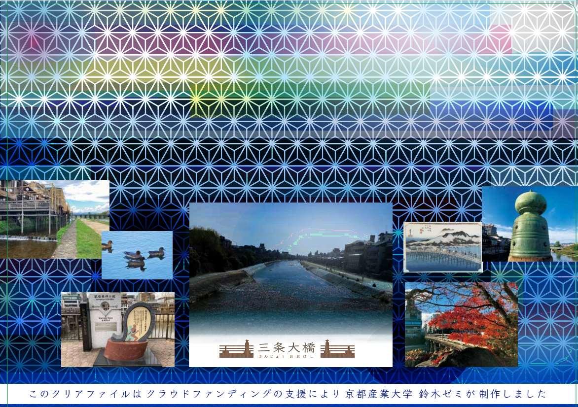 京都の玄関口である三条大橋は現在進行している補修・修景事業により、約50年ぶりに新しく架け替えられることが決定しているが、前回の修繕工事から50年近くが経過し老朽化が進んでいたにも関わらず、寄付を募るなど改修の決定までに苦労した経緯がある。三条大橋チームの学生らは「新しく生まれ変わる三条大橋を大切にして欲しい、未来へ受け継いで行って欲しい」との思いから、近辺の小学生に納涼床や、水鳥の写真などを載せたオリジナルデザインのクリアファイルを配布し、歴史ある橋の魅力を伝える。