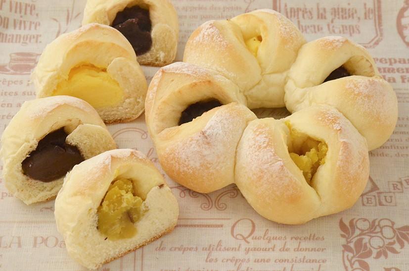 ・粒あん・チョコクリーム・カスタードクリーム・さつまいも甘露煮の4種の味が楽しめる可愛いちぎりパンです。