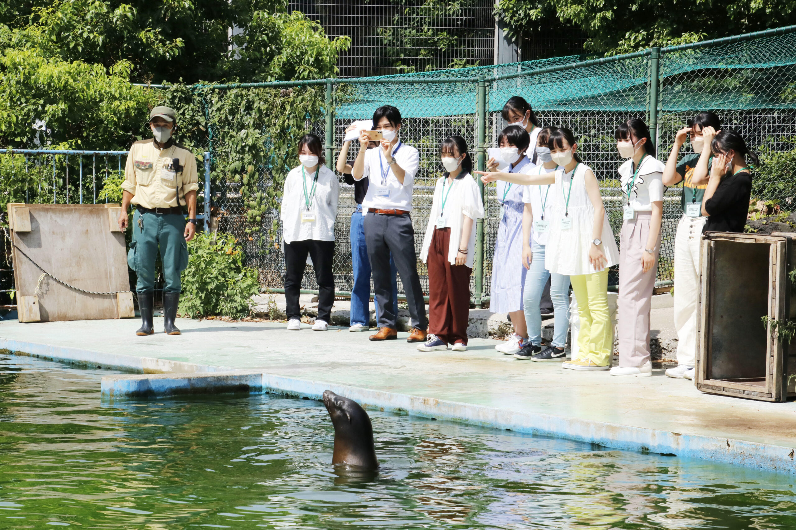 続く体験企画は、実際の動物福祉の取り組みとして、樟蔭中高生にカリフォルニアアシカの氷遊び体験、農芸高校生にワラビーのごはん作り体験に挑戦してもらいました。同園では単調な生活を避けるための取り組みとして、魚を入れて凍らせた氷をアシカに与え、遊んだりしながら中の魚を取り出すよう促しています。参加者がアシカに魚入りの氷を与えると、アシカは氷に近づき、噛んだり、触ってみたりして、中の魚を取りだそうと試行錯誤する様子が観察でき、アシカが嬉しそうに氷で遊ぶ姿に自然と笑みがこぼれました。ワラビーのごはん作りでは、ワラビーが退屈しないように時間をかけて食べてもらうためのフィーダー作りに取り組んでいます。参加者はワラビーが食べやすいようフィーダーに野菜をセットし、獣舎の木の枝に引っ掛けましたが、いつもと違う様子にワラビーが警戒して食べる様子が観察できませんでした。参加者は少しがっかりした様子でしたが、動物が思った通りの行動をとってくれないことを学ぶ機会となりました。