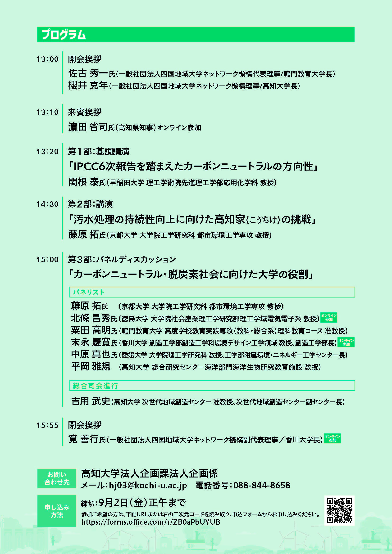 今回のシンポジウムのテーマを「カーボンニュートラル・脱炭素社会」としました。専門家による講演やパネルディスカッションを通じて各大学の取組についてご紹介するとともに、四国の今後の取組について意見交換を行います。