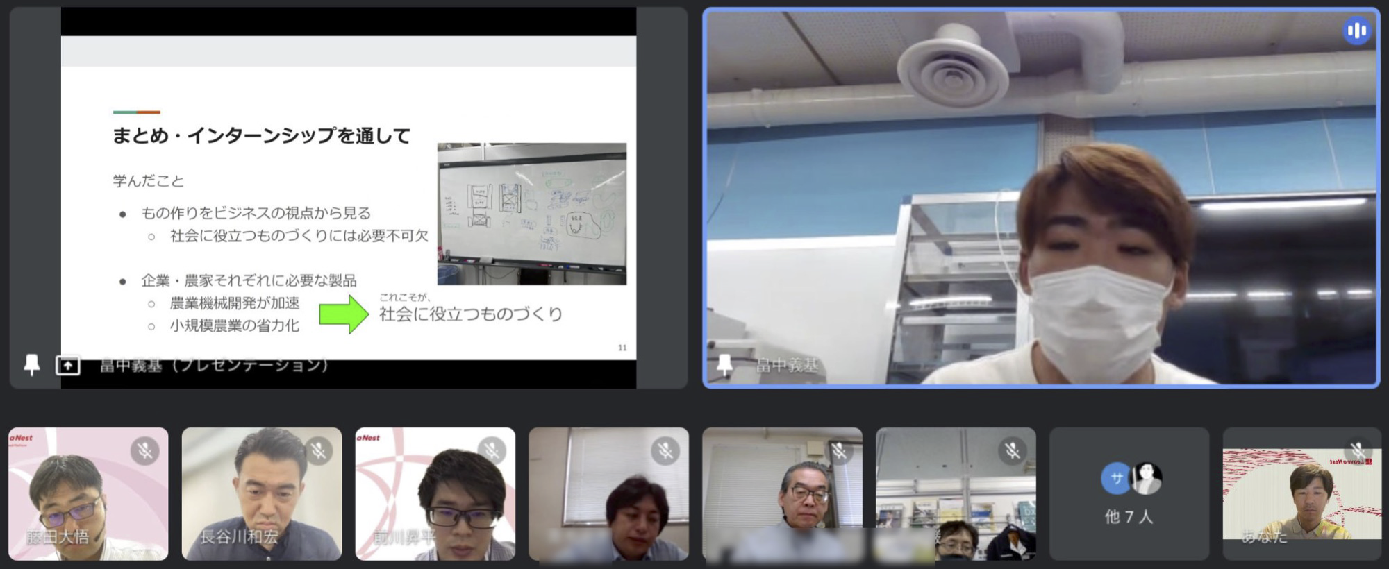 インターンシップの終盤では、リバネスが主導し、Garage Otaも所属するスーパーファクトリーグループのカンファレンスにて、研究プレゼンを実施。インターンシップでの成果発表と、研究開発のブラッシュアップに向けた議論を行いました。
