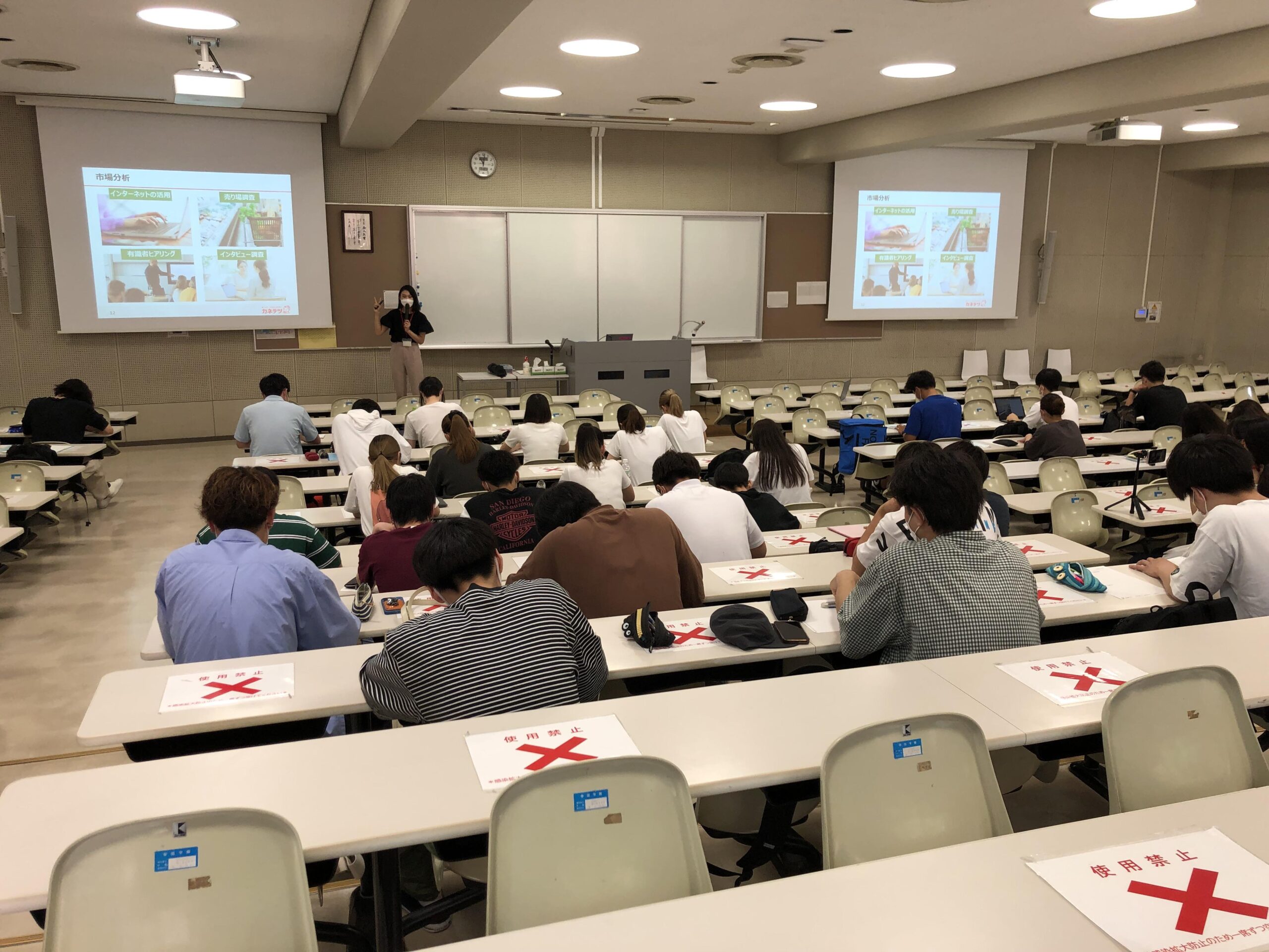 続いて、久保田氏自身が取り組んだプラントベースの新製品「Vegesh カレーフライ」の開発について、新製品開発の意義やねらい、データによる綿密な市場調査や売り場での消費者行動調査や検証、流通業者との交渉を経て新製品発売に至るプロセスについて、開発・製造部門との調整などの苦労話を交えながらわかりやすく解説。久保田氏に続いて同社管理部の前村怜花氏が登壇し、会社の全体像や職場の雰囲気、求める人材像を紹介していただき、学生にとって企業活動について理解を深める絶好の機会となりました。