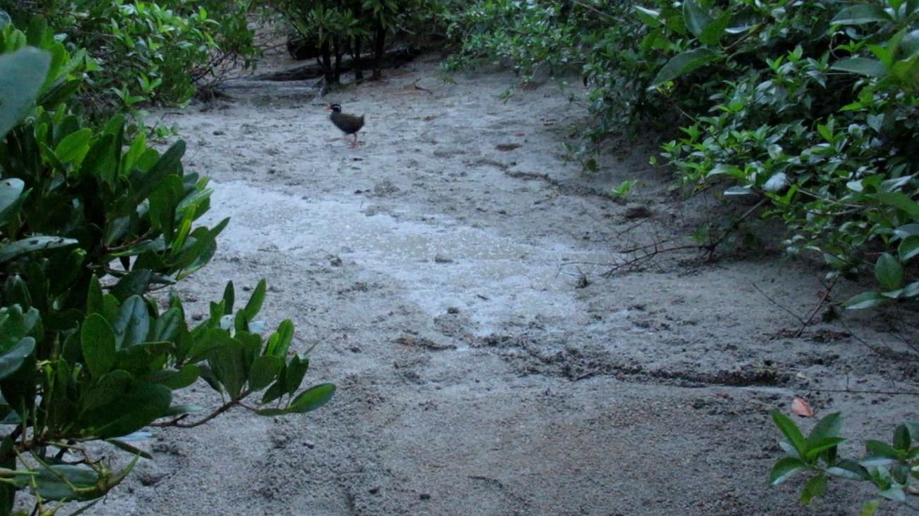 早朝に軽石で覆われたマングローブ干潟を横断するヤンバルクイナの様子を動画撮影として記録した。ヤンバルクイナは捕食動物の少ない沖縄特有の自然環境から、日本国内で唯一の飛べない鳥へと進化したと考えられている。絶滅危惧IA類に指定されている希少種であるが、朝夕は活動が活発となり、沖縄北部の道路を横断することもある。ヤンバルクイナの多くは森の中に生息しているため、軽石の影響は無いと考えられる。