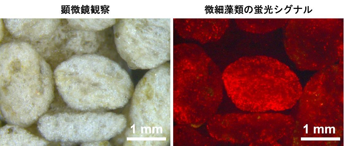 軽石表面は、微細藻類などの目に見えない微生物の生息場所にもなる。左図の写真では生物の存在は分からないが、軽石に青色の光を照射すると、植物由来の特徴的な赤色蛍光を小さな輝点として観察できることが分かった(右図:微細藻類のクロロフィル蛍光)。