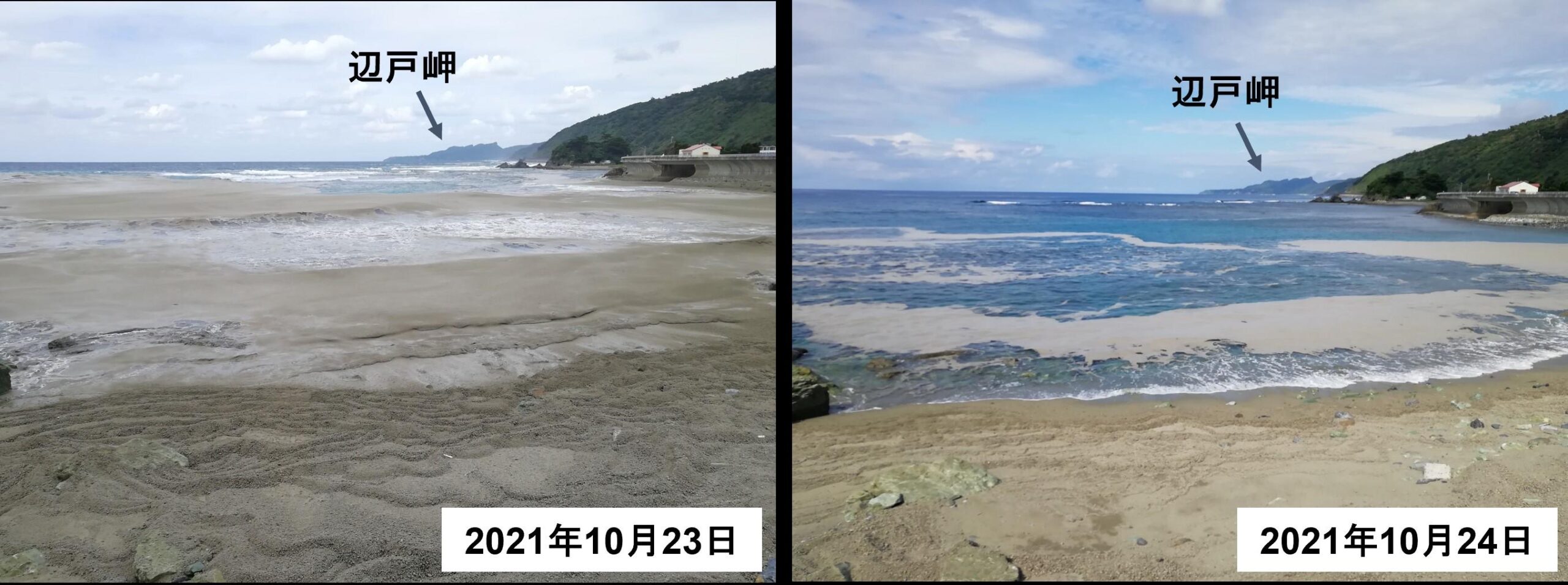 一日で劇的に海岸の様子が変化する様子を記録した。左図は軽石ラフトが海岸に漂着している様子で、右図は定点観察にて海岸から離岸した直後のラフトを撮影したものである。この現象は、風向が沖合に向かう風に変わったことにより発生したようである。潮汐と風向の影響により、沖縄各地の海岸で軽石ラフトの漂着・離岸が繰り返されたと考えられる(国頭村佐手にて撮影)。
