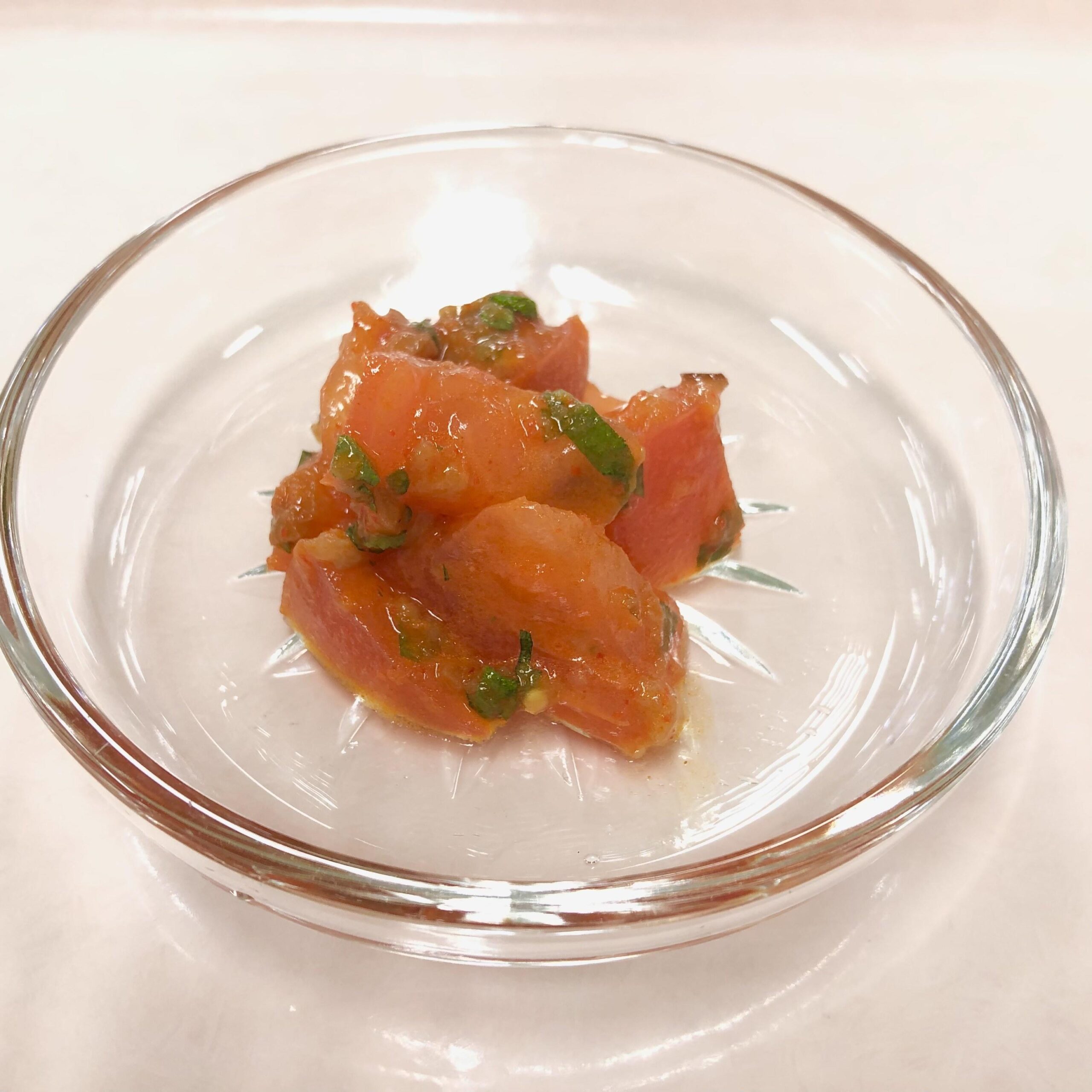 ■梅トマキムチ和え:フレッシュトマトをキムチ風のピリ辛で食欲をそそる味付けにし、梅干しのさっぱり感が暑い季節にもぴったりな一品