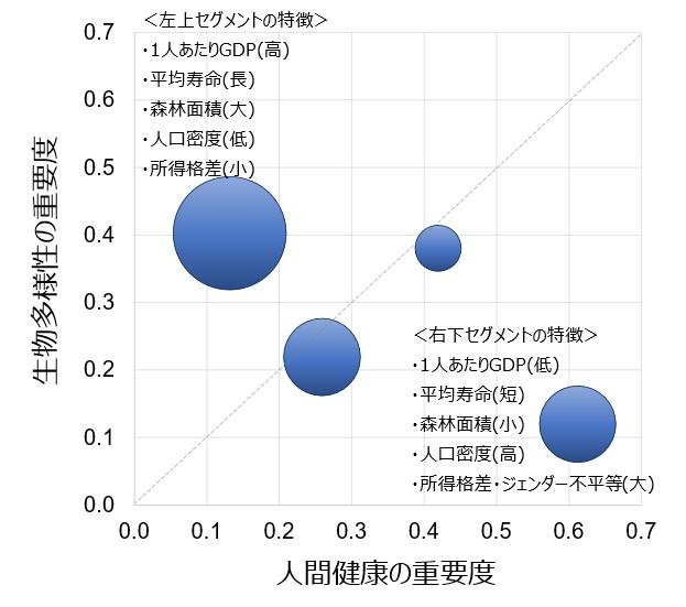 ●高所得国(一人当たりGDPが1.6万ドル以上)では生物多様性を保全する対策が優先され、中所得国以下(一人当たりGDPが1.6万ドル未満)では人間健康を改善する政策が優先される傾向がみられました。