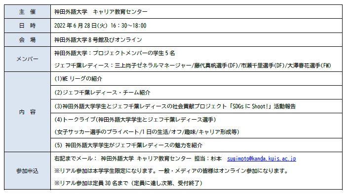 神田外語大学(千葉市美浜区/学長:宮内孝久)の学生と女子プロサッカーリーグWEリーグに所属する「ジェフユナイテッド市原・千葉レディース(以降、ジェフ千葉レディース)」の選手で組織した、社会課題解決を目的としたプロジェクト「SDGsにShoot!」が2022年6月28日(火)にこれまでの活動報告会をリアル・オンラインで実施します。当日は、プロジェクトメンバーである本学学生5名と、ジェフ千葉レディースからはゼネラルマネージャーの三上尚子氏、ディフェンダーの藤代真帆選手、市瀬千里選手、フォワードの大澤春花選手が参加します。日本女子プロサッカーリーグ(以降、WEリーグ)の理念やジェフ千葉レディースのチーム紹介からはじまり、誹謗中傷問題へのSNSを活用した啓発活動(SDGs目標10・16)や千葉市稲毛海浜公園のビーチクリーン活動(SDGs目標14)等についての報告、トークライブ等がおこなわれる予定です。