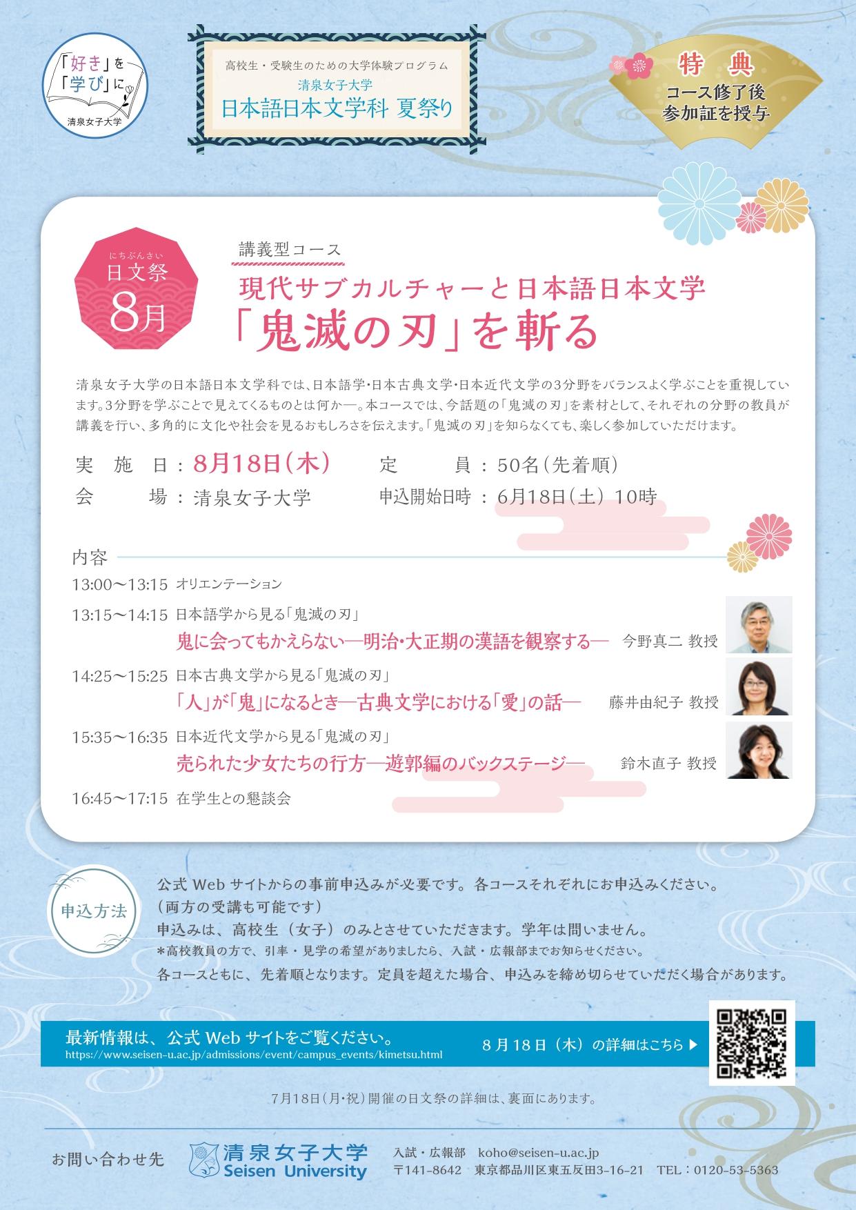 清泉女子大学が7・8月に高校生・受験生を対象としたイベント「日本語日本文学科夏祭り」を開催 — 7月8月の18日は日本語・日本文学に全集中!