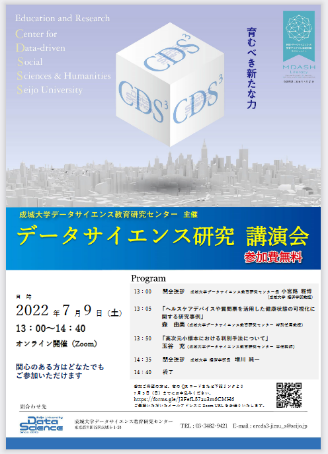 成城大学(東京都世田谷区 学長: 杉本 義行)は、データサイエンス教育研究センターが主催する「データサイエンス研究」講演会を、2022年7月9日(土)13時よりオンライン(Zoom)にて、参加費無料で開催いたします。