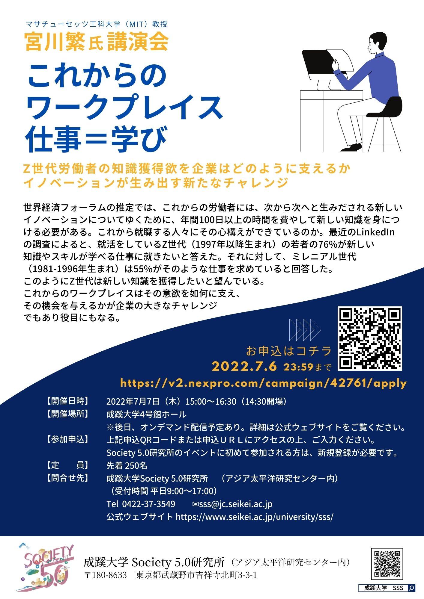 成蹊大学(東京都武蔵野市、学長:森雄一)は、2022年7月7日(木)に成蹊大学Society 5.0研究所主催 特別講演会「これからのワークプレイス 仕事=学び」(会場参加)を開催します。マサチューセッツ工科大学(MIT)教授で成蹊大学Society 5.0研究所特別顧問の宮川繁教授に、Z世代労働者の知識獲得欲を企業はどのように支えるか、イノベーションが生み出す新たなチャレンジについて、ご講演いただきます。参加無料、事前申込制。