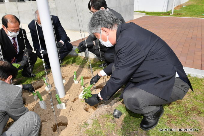 植栽式には、サッポロビールの森本光俊氏(上席執行役員・北海道本社代表兼北海道本部長)、半田輝雄氏(北海道本社北海道戦略営業部長)、栗原史氏(北海道本社北海道戦略営業部参事兼サッポロビール博物館長)のほか、札幌大学の荒川裕生理事長、大森義行学長、さらに学生自治会に所属する学生3名、および女子サッカー部員5名などが参加し、SUcole西側玄関前に合計48株のホップ苗を植え付けた。ホップ苗は全てサッポロビールより無償提供された。