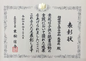 この表彰は、子供の読書活動についての関心と理解を深めるとともに、子供が積極的に読書活動を行う意欲を高める活動を推進するため、特色ある優れた実践を行っている学校として授与されるものです。