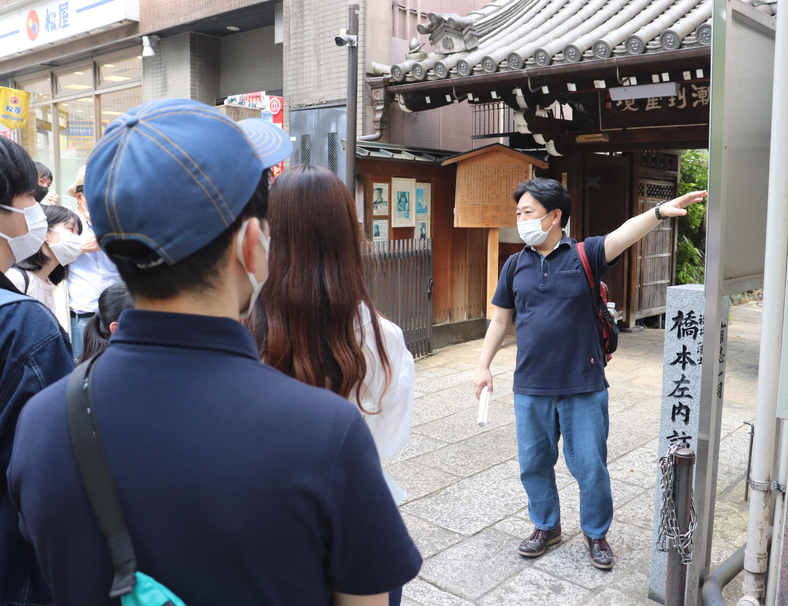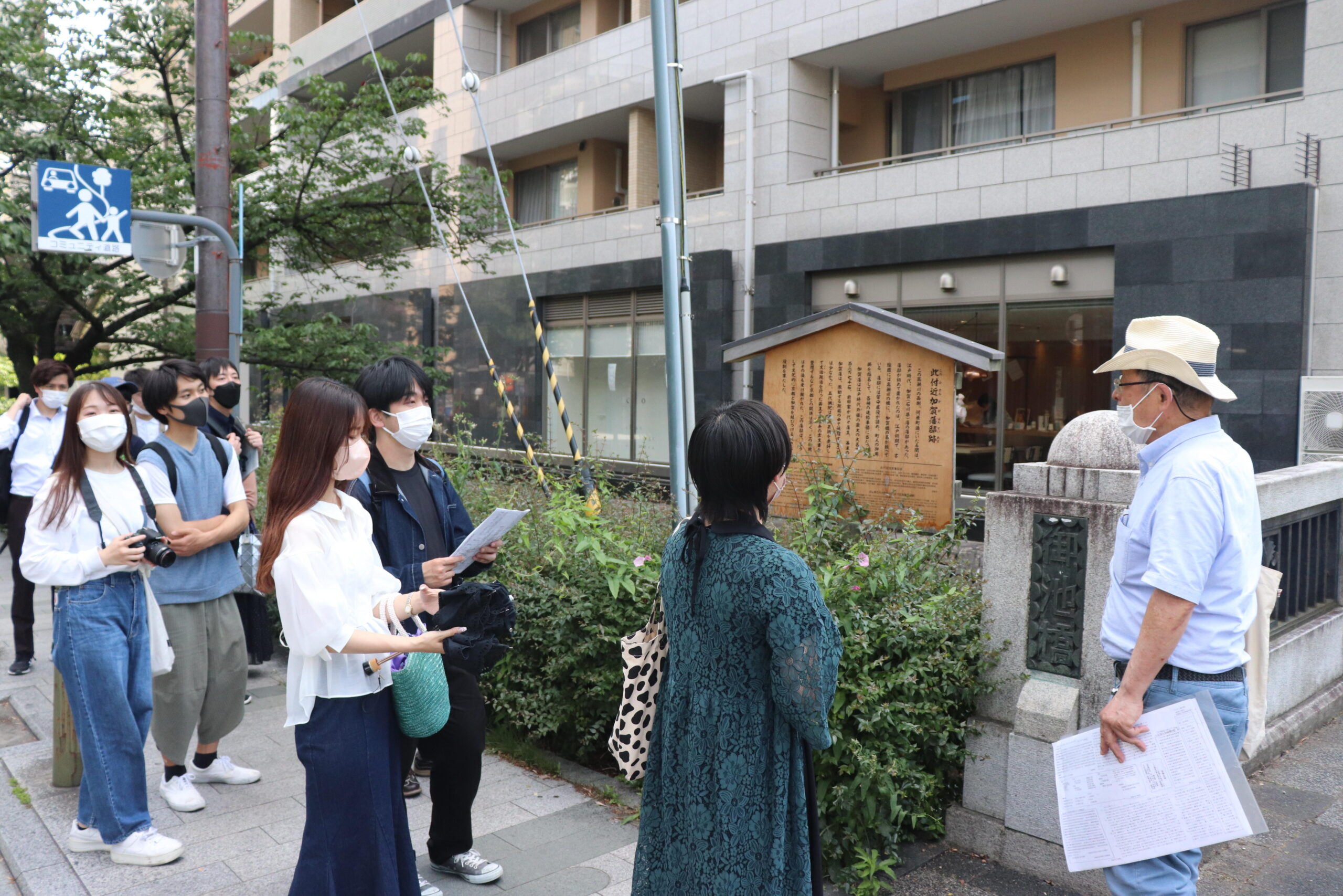 学生たちは事前学習の上、5月21日(土)の記念シンポジウムを聴講。翌日、展示内容に関するディスカッション「明石博高の人と時代を語る」と「明石博高史跡散策」をおこない、互いに京都近代化の理解を深めながら交流しました。史跡散策は「明石博高史跡散策ルートマップ」(松田清・日本研究所客員教授作成)および「明石博高・史跡マップ」(国際日本文化研究センター総合情報発信室発行)に従い、祇園、四条木屋町から高瀬川沿いに二条木屋町をへて丸太町橋に達しました。