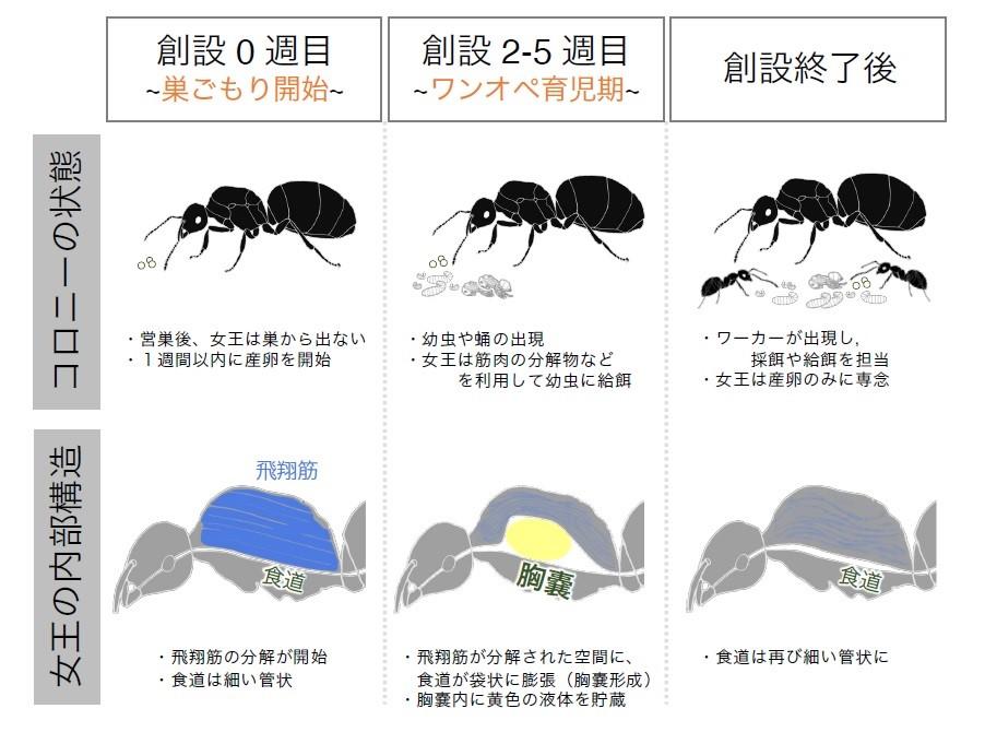 【玉川大学・九州大学・慶応義塾大学 共同研究成果】育児期間中の女王アリにおいて飛翔筋分解と同調した「胸嚢」の形成過程を解明 — 女王アリが飲まず食わずでワンオペ育児をできるわけ —