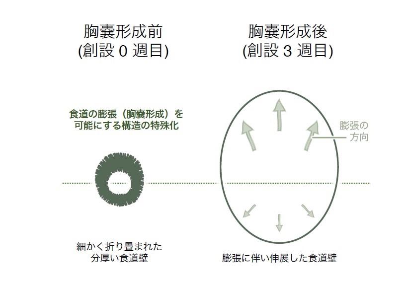 ●膨張する予定の食道背面部にみられる肥厚した食道壁のシワ構造は、胸嚢形成に特殊化した構造であることを示唆する。