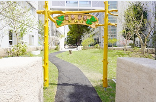デザインには、学園の理念が込められています。人見記念講堂の第一緞帳に描かれているデザイン「躍動する光」がモチーフです。研修施設がある東明学林から臨む富士山や箱根の山々の上空を、3人の女性がオーロラの光のように、「世の光」となって世界へ飛翔した姿を表現しています。このエリアの名称は今後学生を対象に募集する予定です。