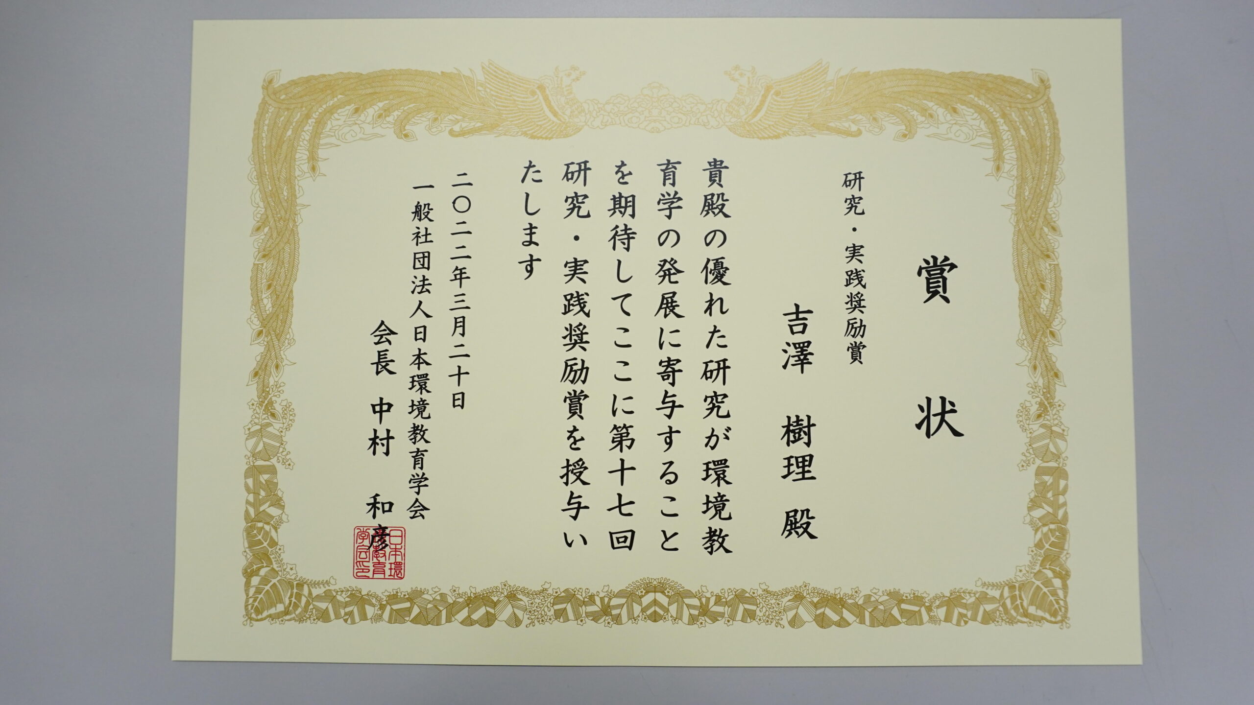 このたび吉澤 樹理講師(教育学部 児童教育学科)が、日本環境教育学会において「第17回環境教育研究・実践奨励賞」を受賞いたしました。