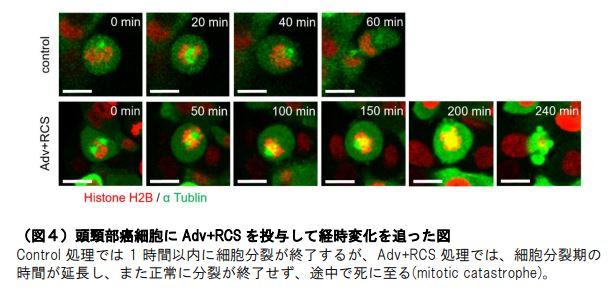 また、なぜ Adv + ARC 併用によって薬剤の効果が上昇するのか検証を行ったところ、Adv 単剤で処理した時は、細胞が Adv の薬効に抗い DNA 修復を行うために細胞周期を止めるためのシグナル(Chk1 のリン酸化)の活性化が惹起されますが、ここに RCS を同時添加することで細胞周期が進行し、DNA 二本鎖切断が誘導されることで細胞死がさらに強まることを発見しました(図3)。そしてこの細胞死の増強は M 期への強制的エントリーによる mitotic catastrophe が強く誘導されることによって起こることが判明しました(図4)。